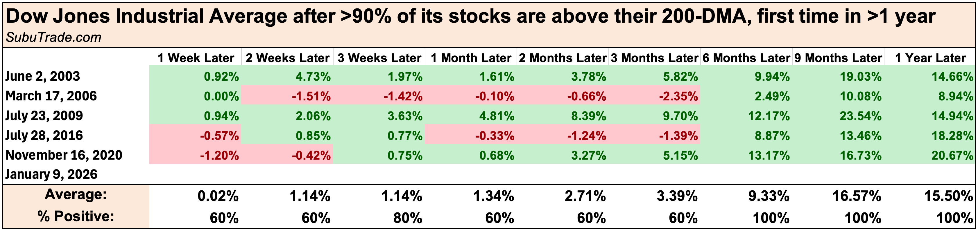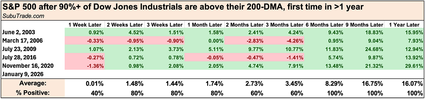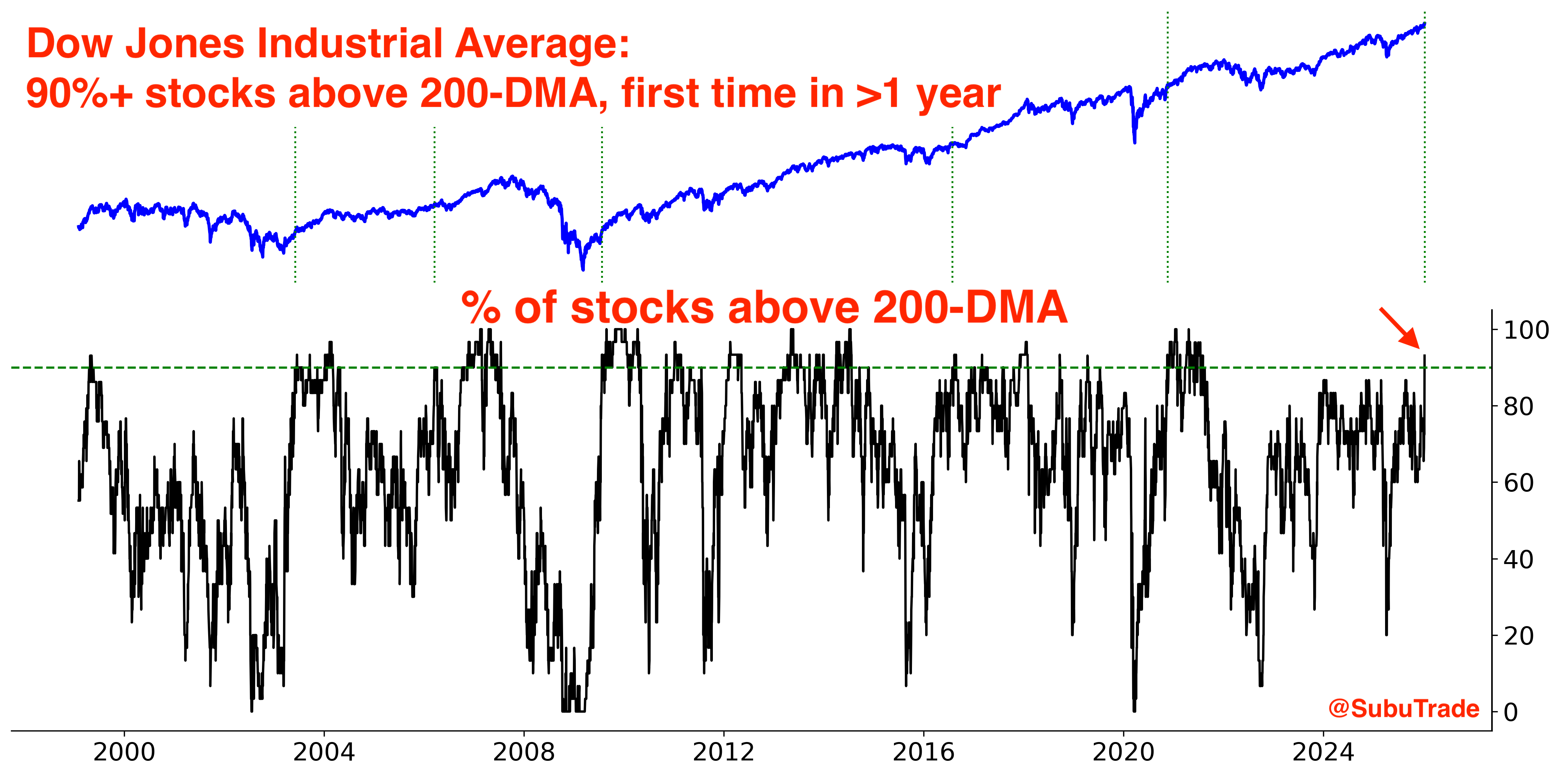 Nowhere is this more evident than in the Dow indices. For the first time since 2021, the Dow Jones Industrial Average saw more than 90% of its stocks above their 200-day moving average.