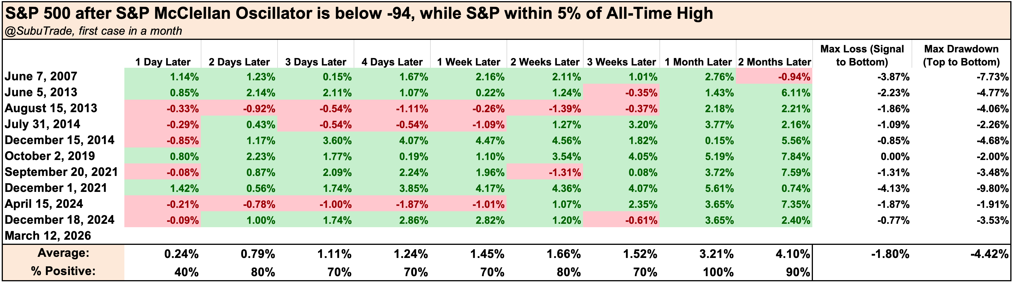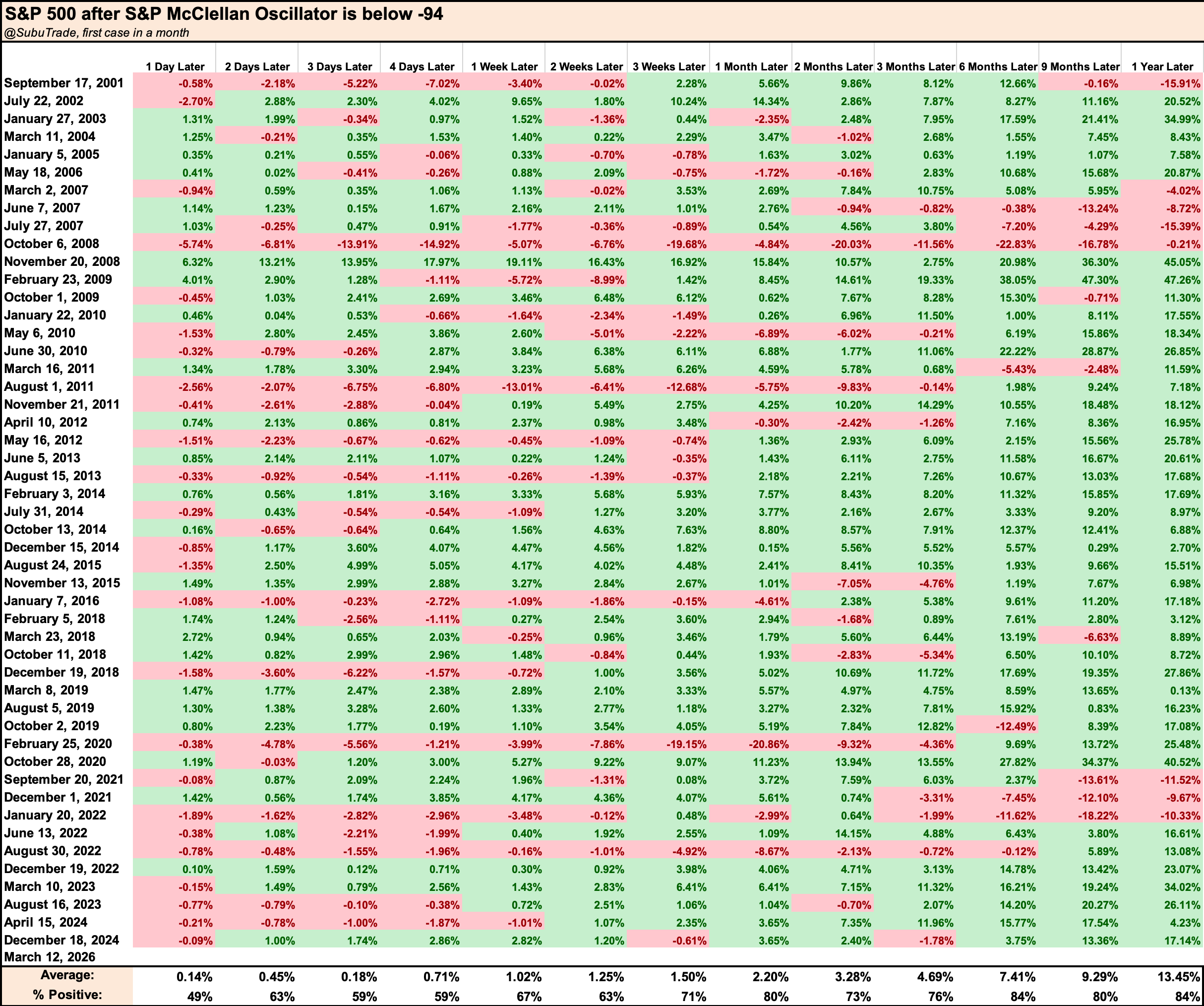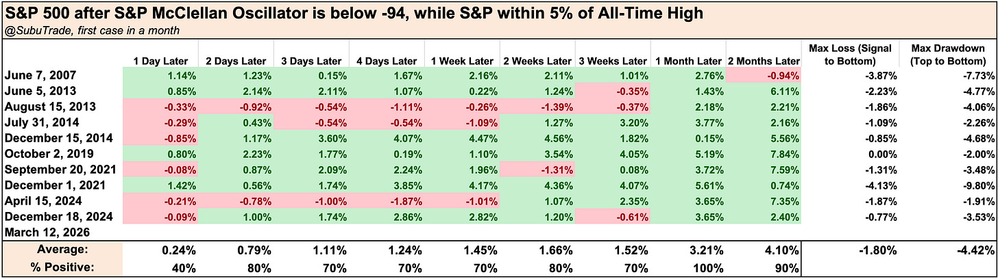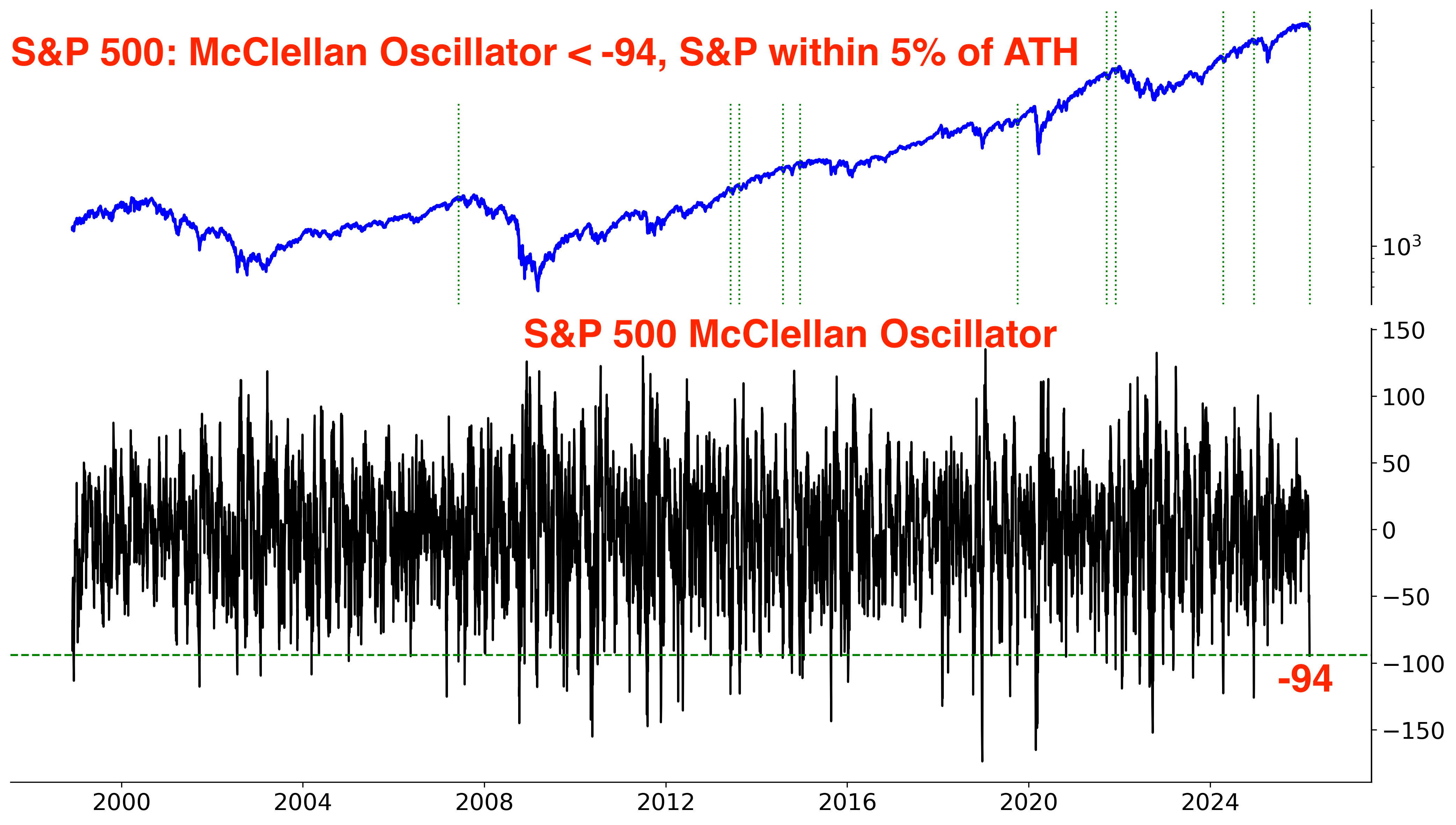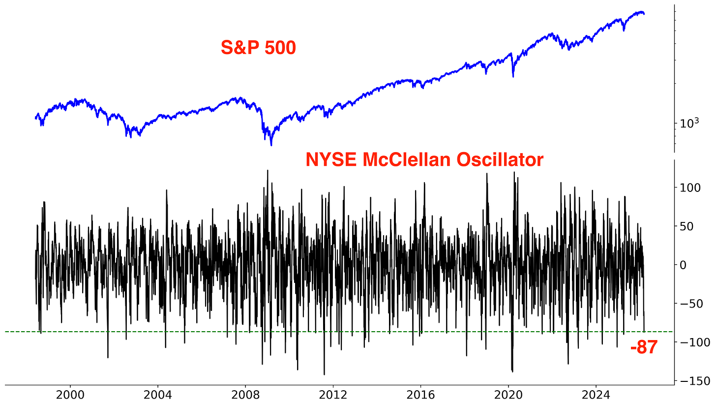 The S&P 500 McClellan Oscillator is below -94. Breadth is very oversold; even moreso than during last April’s Liberation Day crash: