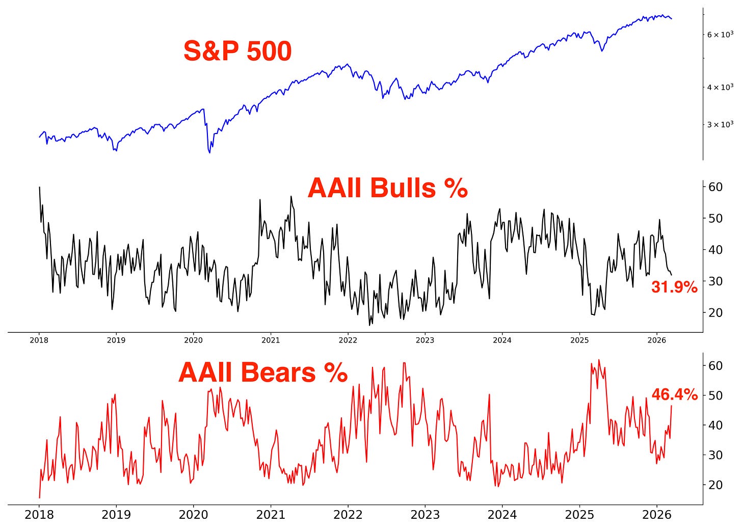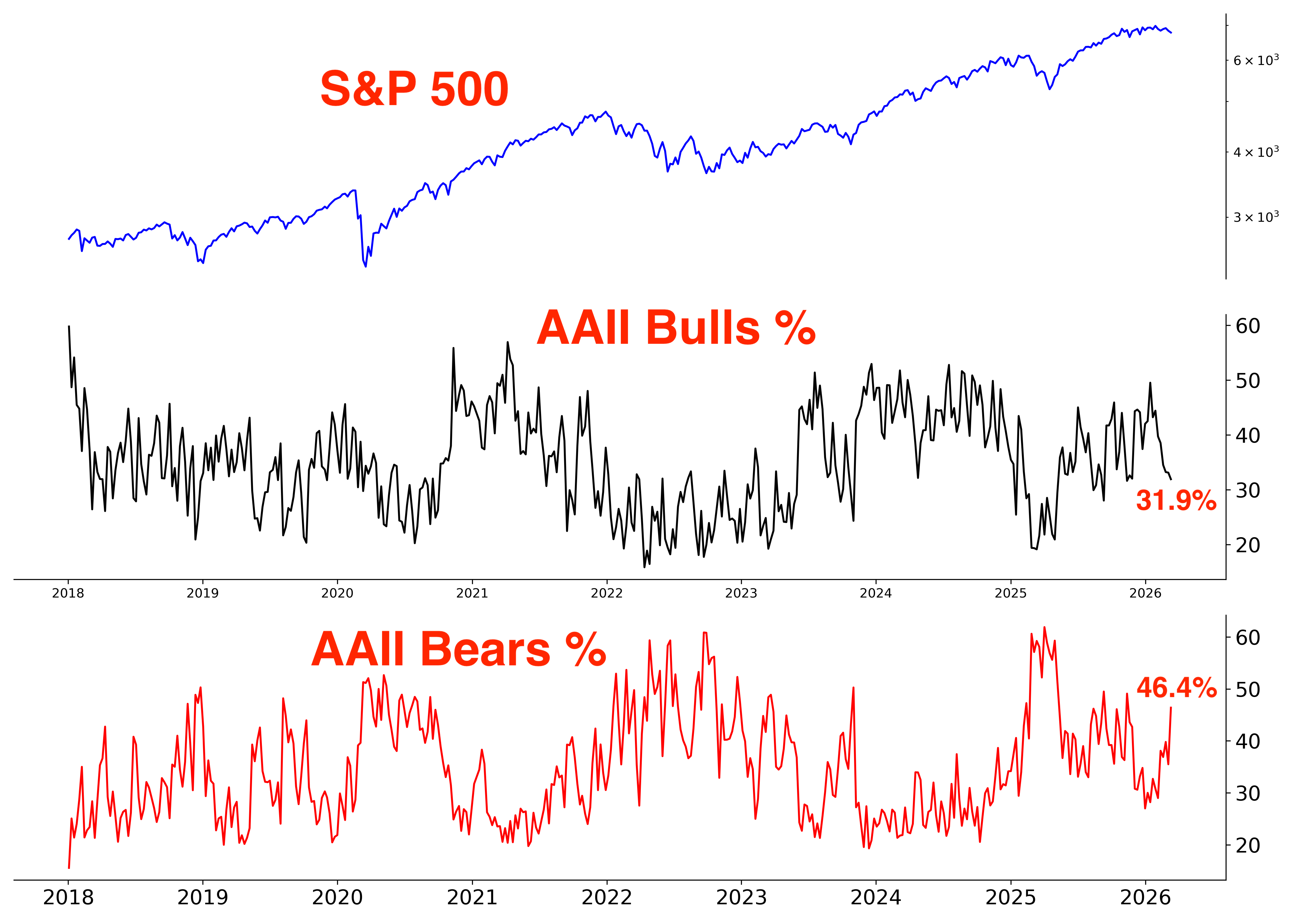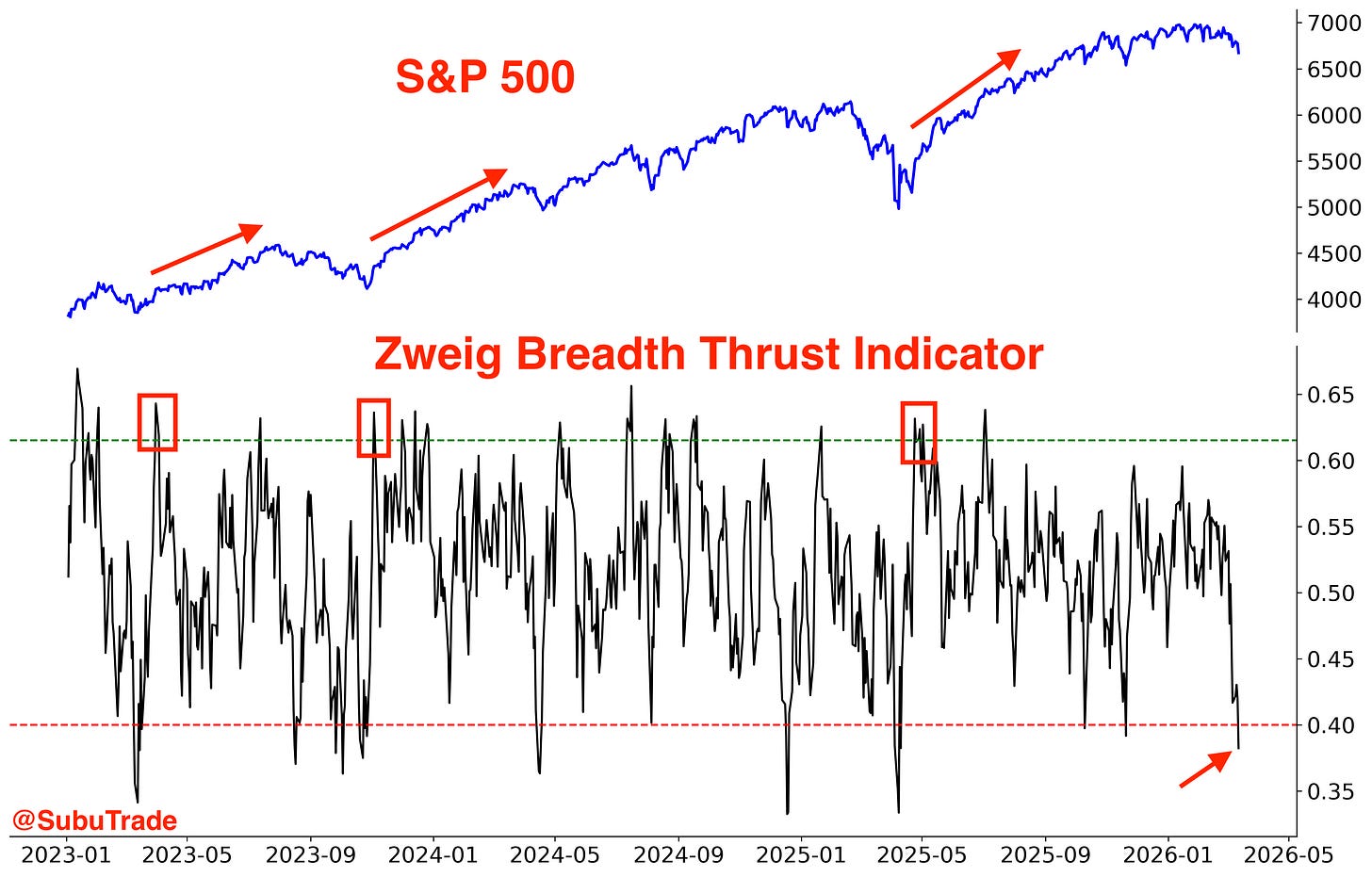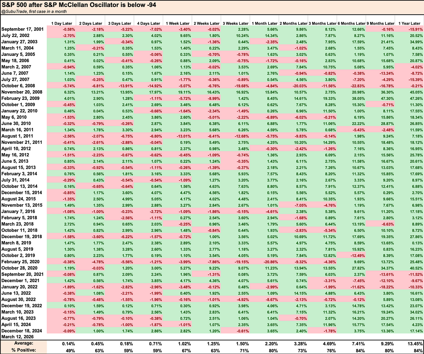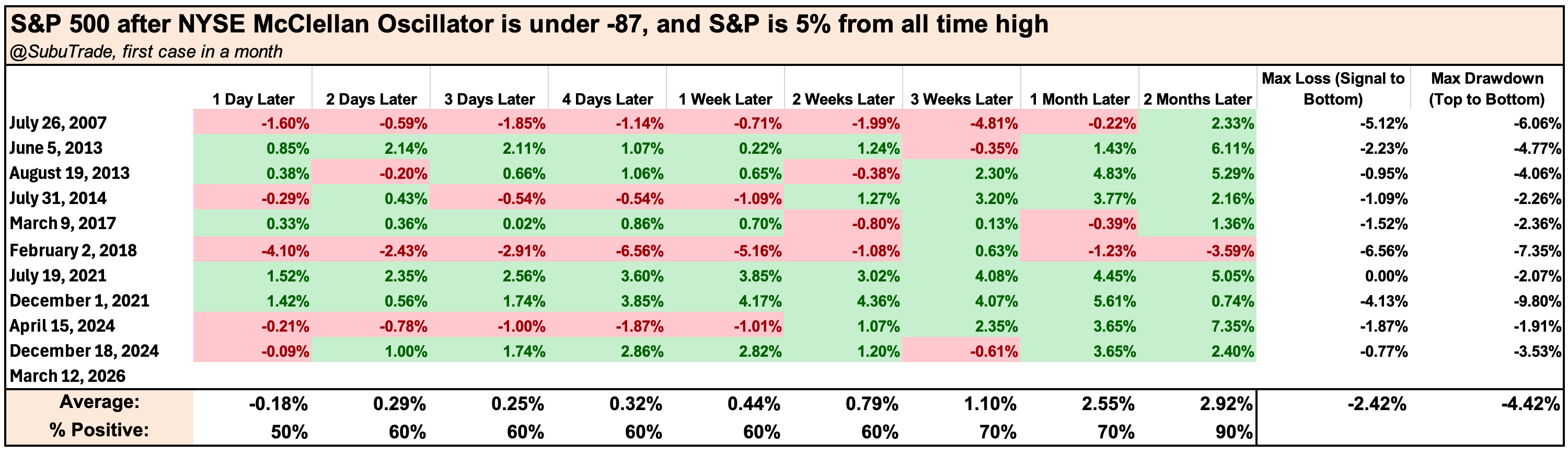 The S&P 500 McClellan Oscillator is below -94. Breadth is very oversold; even moreso than during last April’s Liberation Day crash: