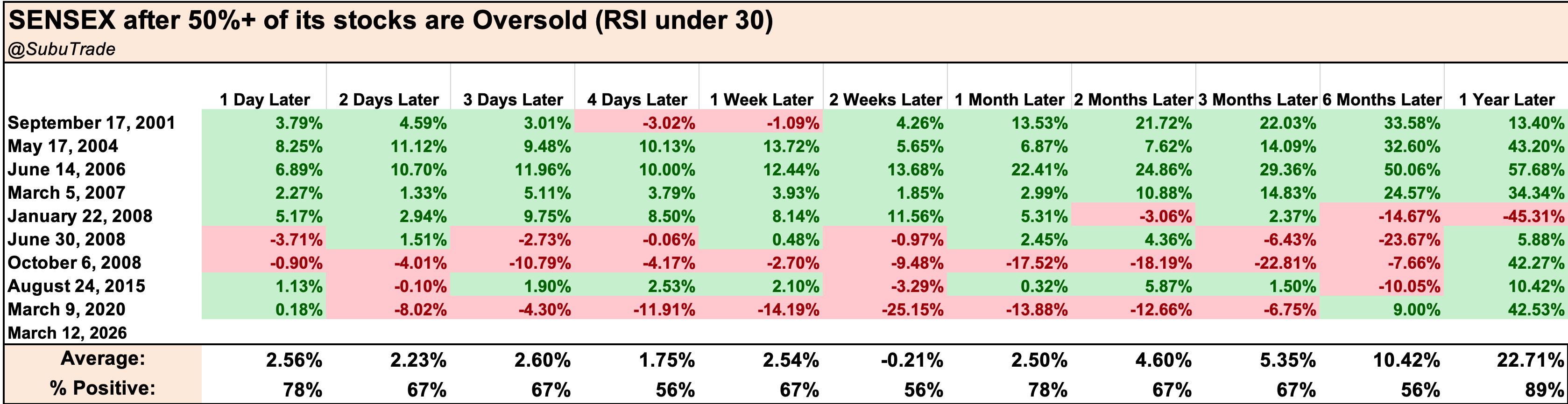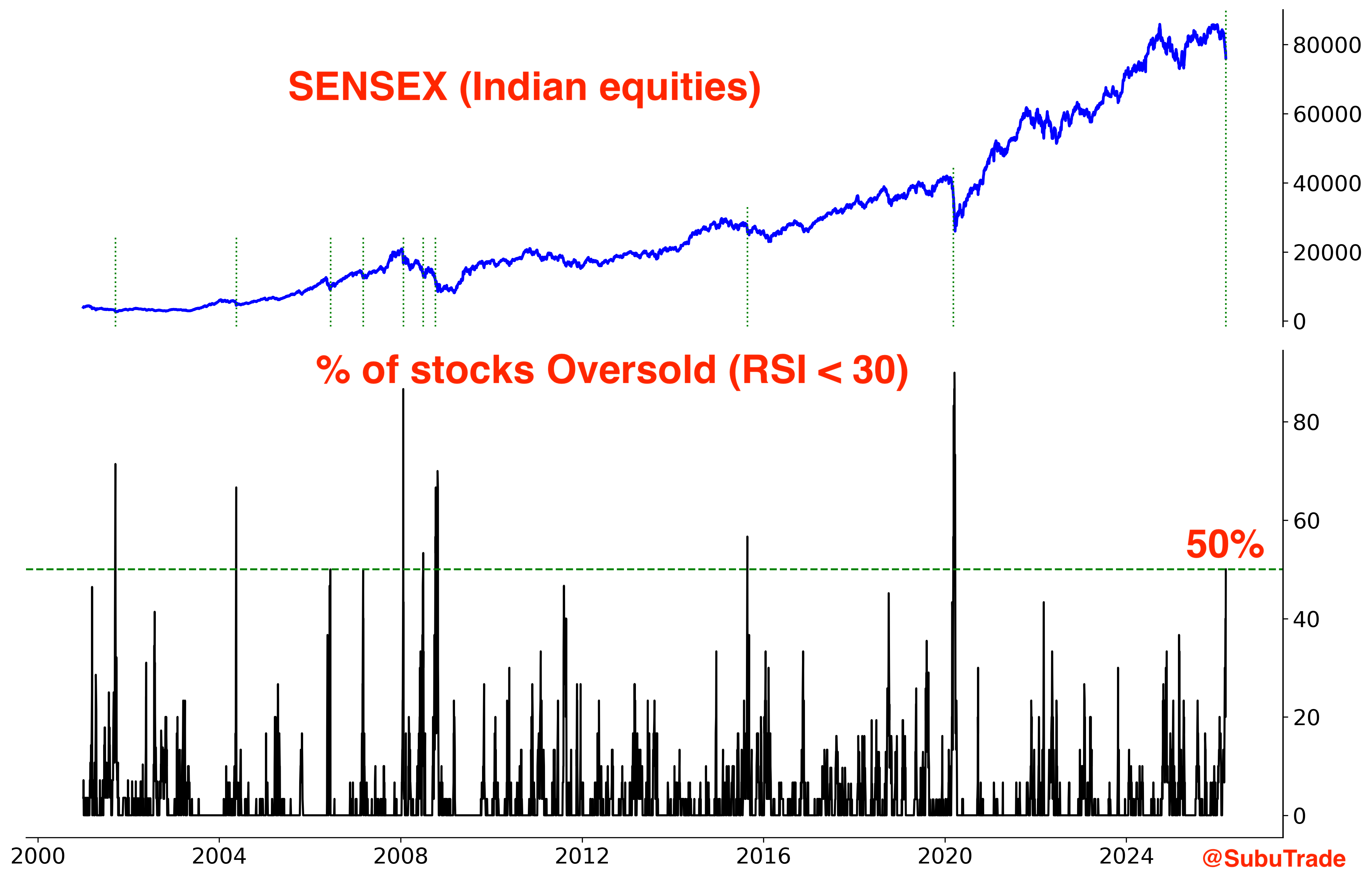 Indian equities have taken a hit from the Iran war. Half of SENSEX stocks are now oversold (RSI under 30):