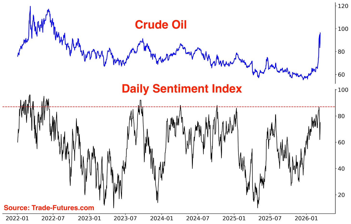 Oil spiked, and everyone expects it to come back down (just look at the Term Structure). Crude Oil’s Daily Sentiment Index spiked along with price: