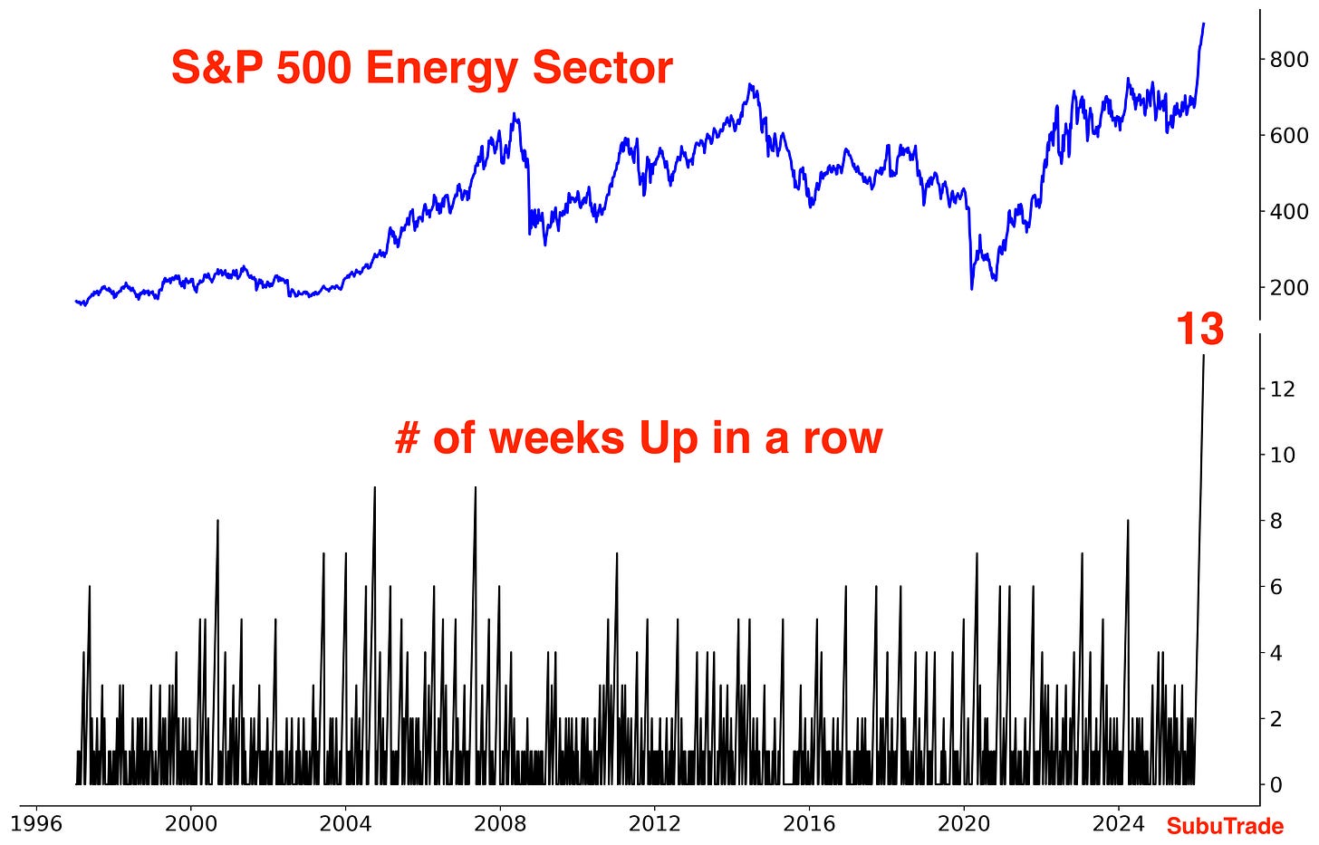 As investors factor in “higher oil prices for longer”, energy stocks are rallying. The S&P 500 Energy sector is up a record 13 weeks in a row.