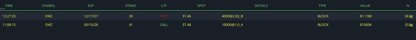 In the first trade, a trader sold 4,000 December 2027 $30 puts at the bid, collecting about $1.13M in premium, which suggests a neutral-to-bullish stance, as the seller profits if EWZ remains above $30 and is effectively willing to own the ETF at a significantly lower level than the current price around $37.5.