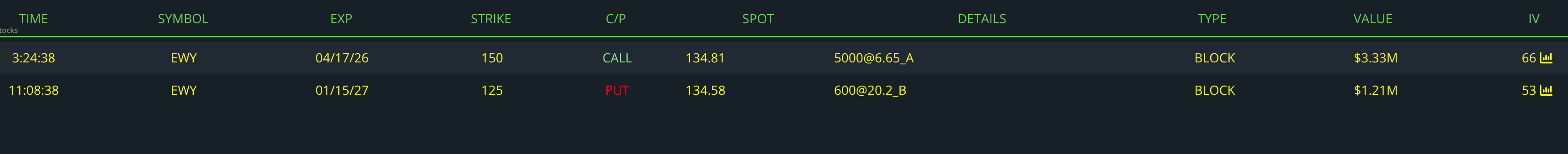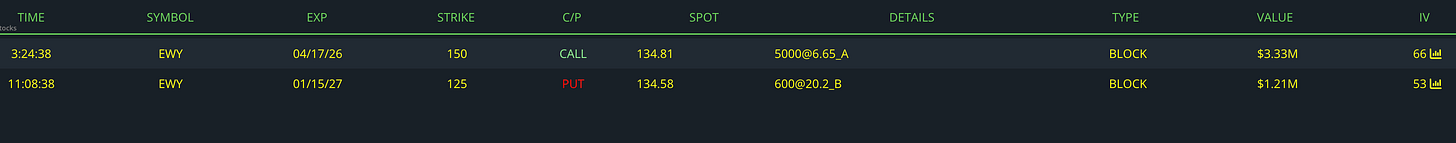 In the second trade, a different trader sold 600 January 2027 $125 puts at the bid, collecting roughly $1.2M in premium, which indicates a neutral-to-bullish stance, as the seller benefits if EWY stays above $125 and is effectively willing to own the ETF at a lower price if assigned.