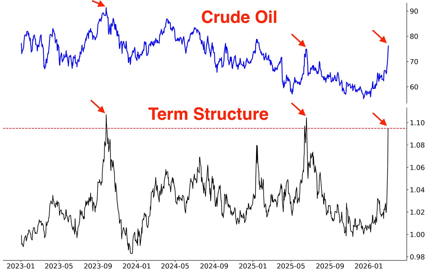 Oil’s term structure is in extreme backwardation. Prior spikes in the past 3 years were topping signs for oil: