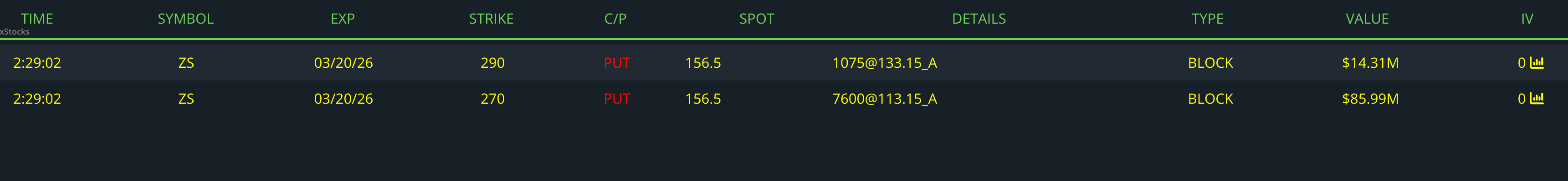 This trade appears to be a large institutional synthetic short position in Zscaler (ZS) established using deep ITM puts that expire very soon (Mar 20, 2026). The trader aggressively bought 7,600 contracts of the 270P and 1,075 contracts of the 290P at the ask, paying about $100M in premium, but because these puts are extremely deep ITM and near expiration, almost the entire price is intrinsic value, meaning the options behave almost exactly like shorting stock with delta near −1. In total, the position represents roughly 867,500 shares of synthetic short exposure (~$135M notional). Given the very short time to expiry, this is more consistent with a short-term hedge.