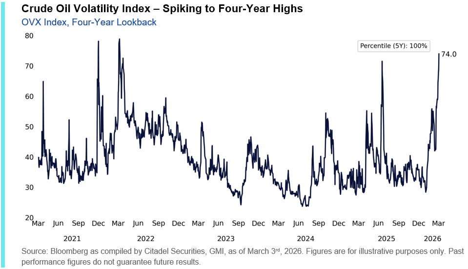“Amidst increasing geopolitical tensions, crude oil volatility has also severely increased, with OVX (crude oil VIX) spiking back to highs not seen since the beginning of the Russia/Ukraine war (2022).”