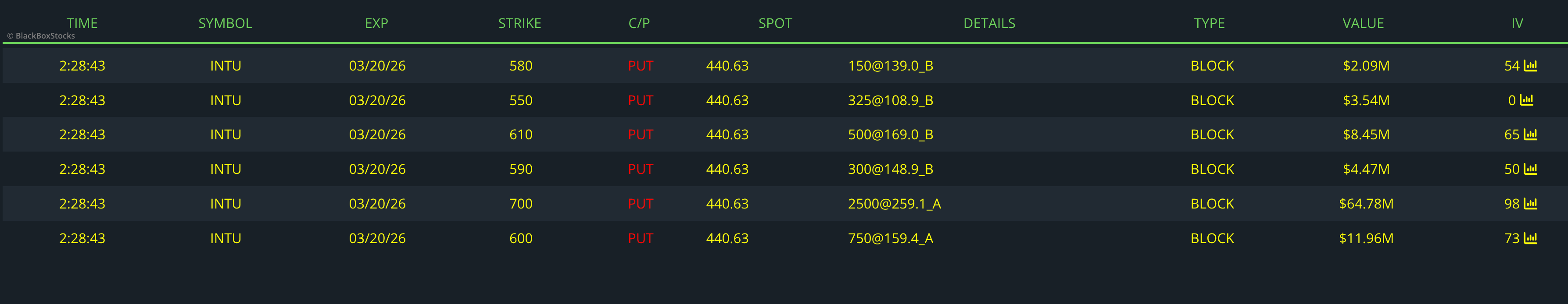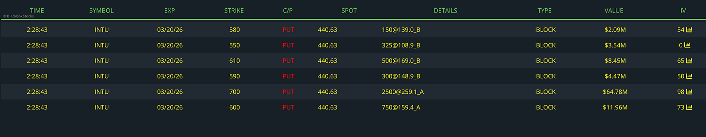This flow most likely represents a large institutional synthetic short or hedge on Intuit (INTU) using deep ITM puts. The trader aggressively bought the 700P (2500 contracts) and 600P (750 contracts) at the ask, which behaves almost like shorting stock because deep ITM puts have delta near –1. At the same time, the trader sold smaller amounts of 610P, 590P, 580P, and 550P at the bid, likely to partially finance the expensive deep-ITM purchases. The overall structure suggests a very large bearish positioning or portfolio hedge, likely by a fund protecting or offsetting a large INTU long, using options instead of directly shorting the stock.