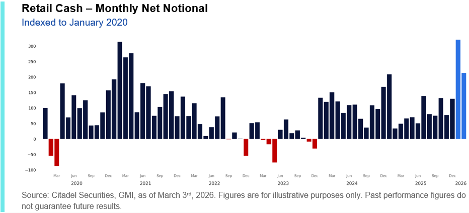 As we highlighted a month ago, January 2026 marked the largest net buying month on record on our platform. February flows, while below that January surge, still ranked as the fifth-largest net buying month in our platform’s history and the strongest in ~five years, since April 2021.”