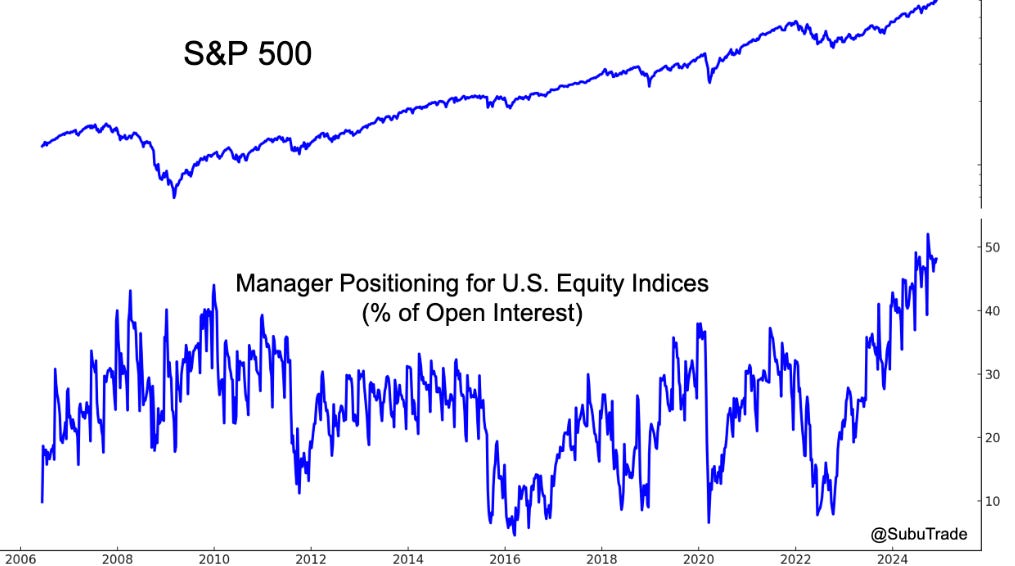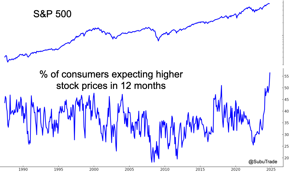 Consumers are also extremely optimistic, with a record % of consumers expecting higher stock prices in 12 months (according to the Conference Board). People expect the second Trump presidency to be similar to the first (stocks rallied strongly in Trump’s first year 2017). But the future rarely plays out just like the past. While we can learn lessons from history, history does not exactly repeat itself.