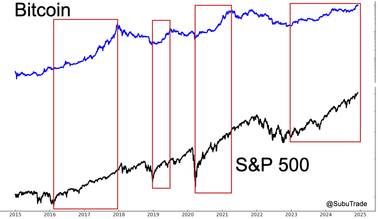 Bitcoin’s largest bull runs occurred when the U.S. stock market was also rallying. In a sense, it’s basically a high-beta play on speculative fervor.