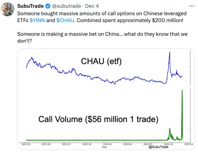 The next big trade is most likely on the short side of U.S. equities. But for now, wait for the stock market’s momentum to weaken; stocks might even melt up before a pullback/correction. Or perhaps the next big trade is in long Chinese equities, a truly contrarian position considering that Trump’s incoming tariffs will do great damage to China. As I tweeted on X, one individual trader just spent $200 million on call options on Chinese leveraged ETFs YINN and CHAU. What do they know that we don’t? With Trump assuming office in January and a U.S.-China showdown imminent, we’ll soon find out.