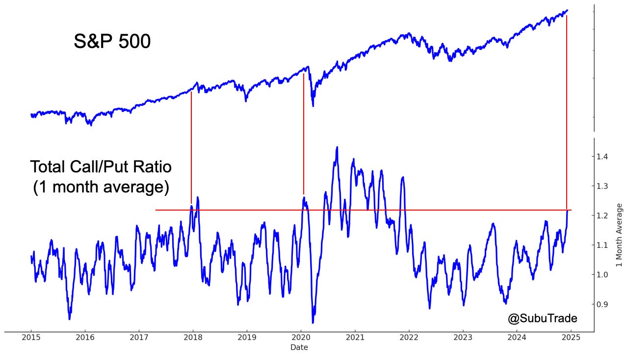 Many indicators reflect this broad bullishness towards stocks. For example, the CBOE’s Equity Call/Put ratio is extremely high. Such bullish positioning led to significant declines in the stock market in January 2018 and March 2020.