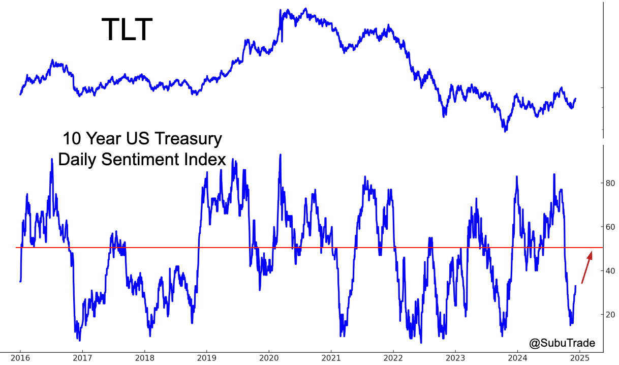 This doesn’t mean that Treasuries can’t continue to make a short term bounce. The bond market is bouncing back after the September-November decline in bond prices pushed sentiment towards extreme pessimism. Past bounces usually saw sentiment rally further before the bond rally stopped.