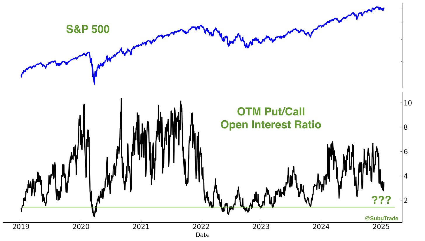 The SPX OTM Put/Call Open Interest Ratio paints a similar story: it didn’t drop to levels that historically signaled strong buying opportunities for equities.