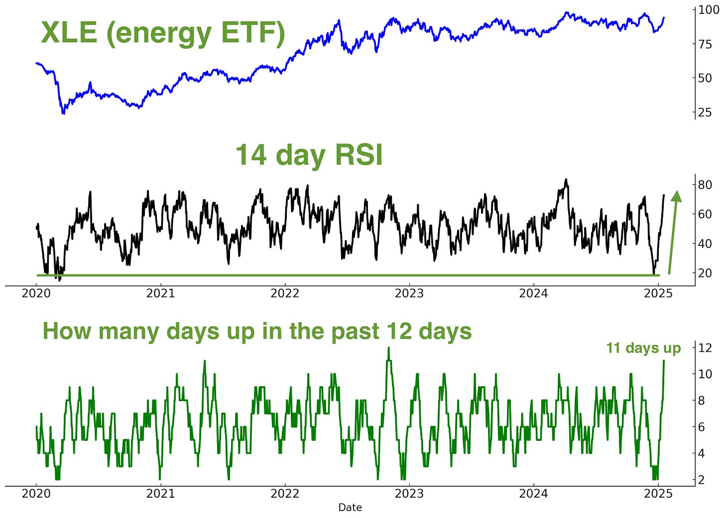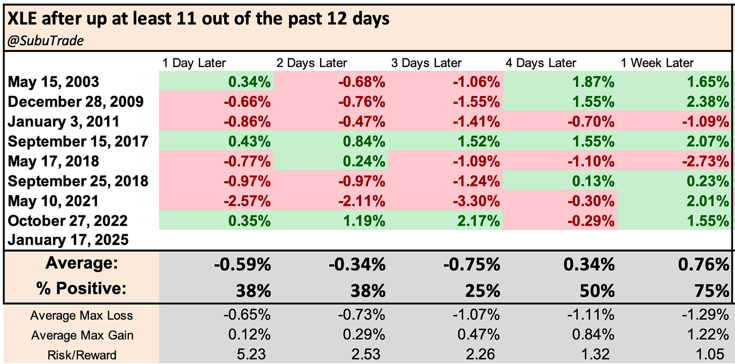 Historical cases of XLE rallying 11 out of the past 12 days usually saw XLE struggle over the next few days.