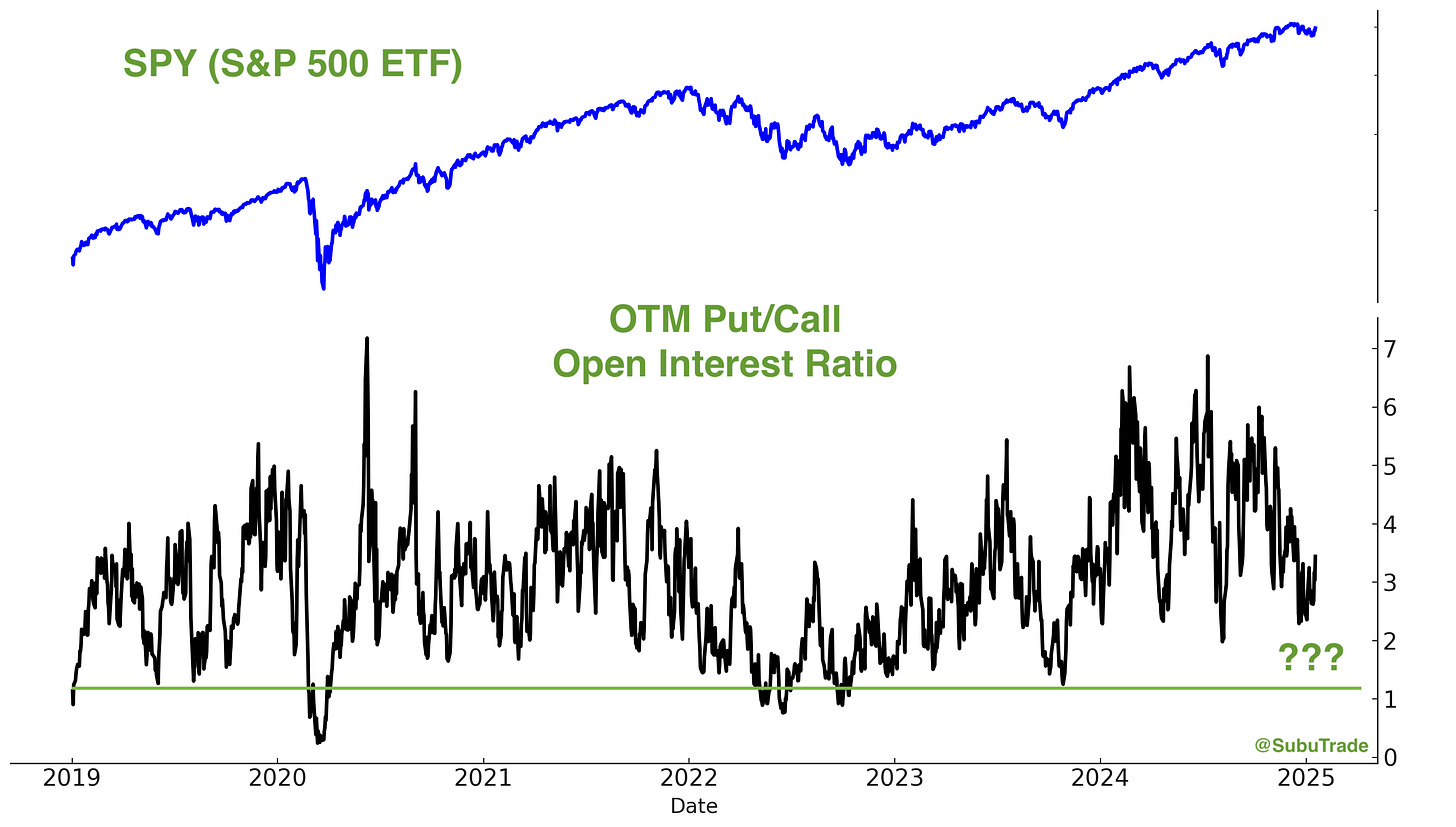 SPY’s ratio did not hit a “panic bottom”. In other words, the recent selloff did not sufficiently punish bullish options traders.