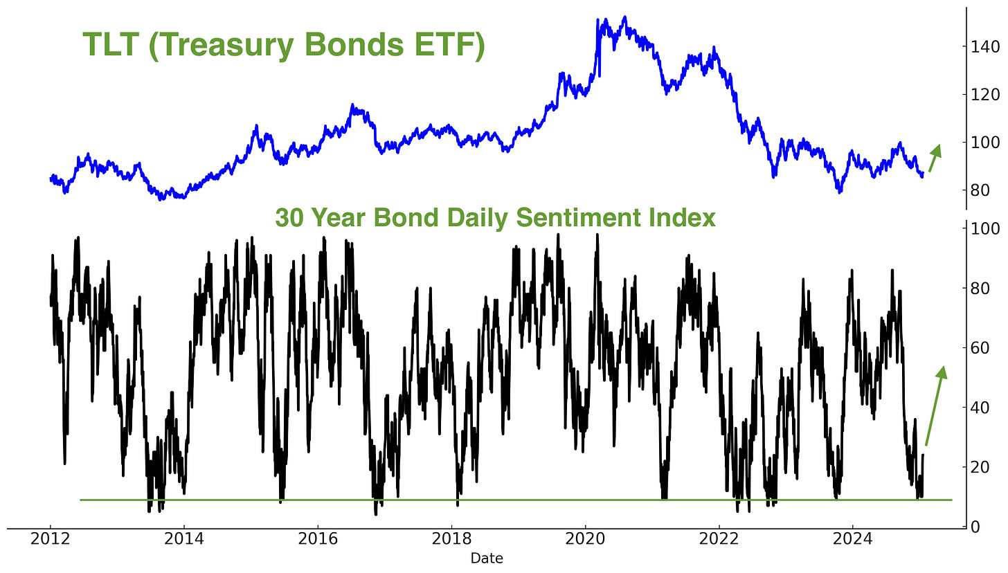 Here’s another look at the 30 Year Treasury Bond’s Daily Sentiment Index. Still extremely low: