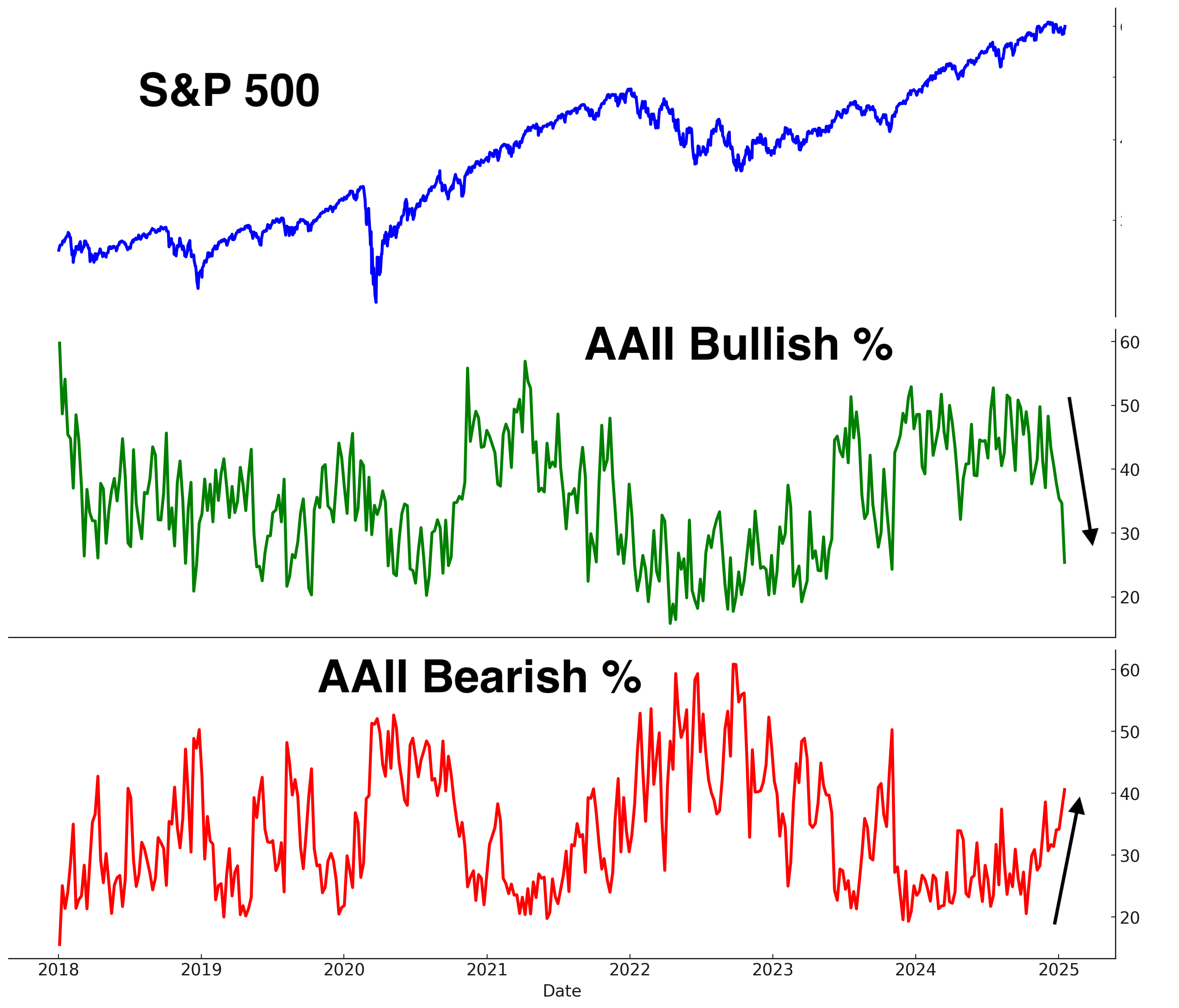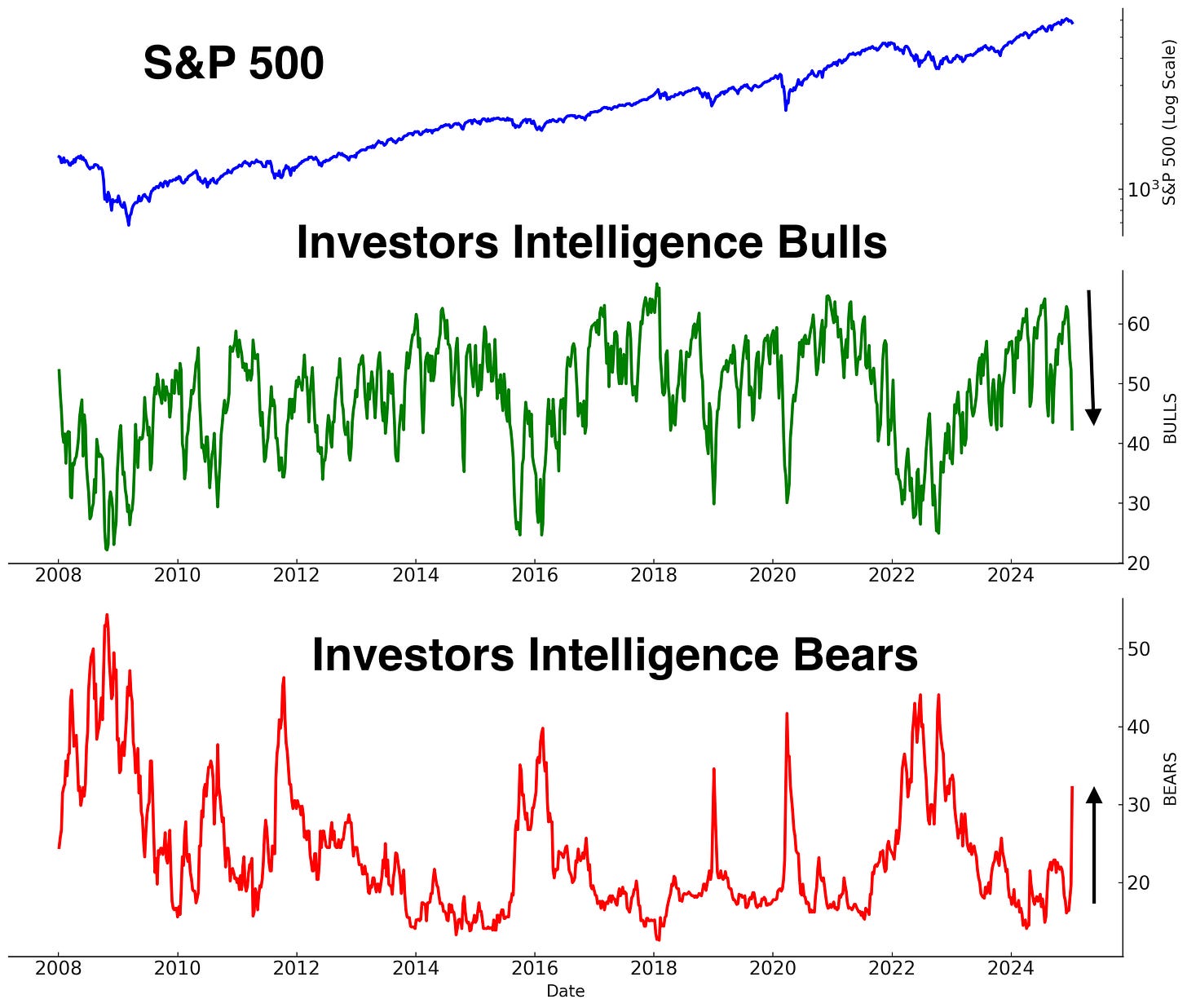Sentiment took a hit during the recent selloff. The Investors Intelligence Bullish % fell and Bearish % spiked:
