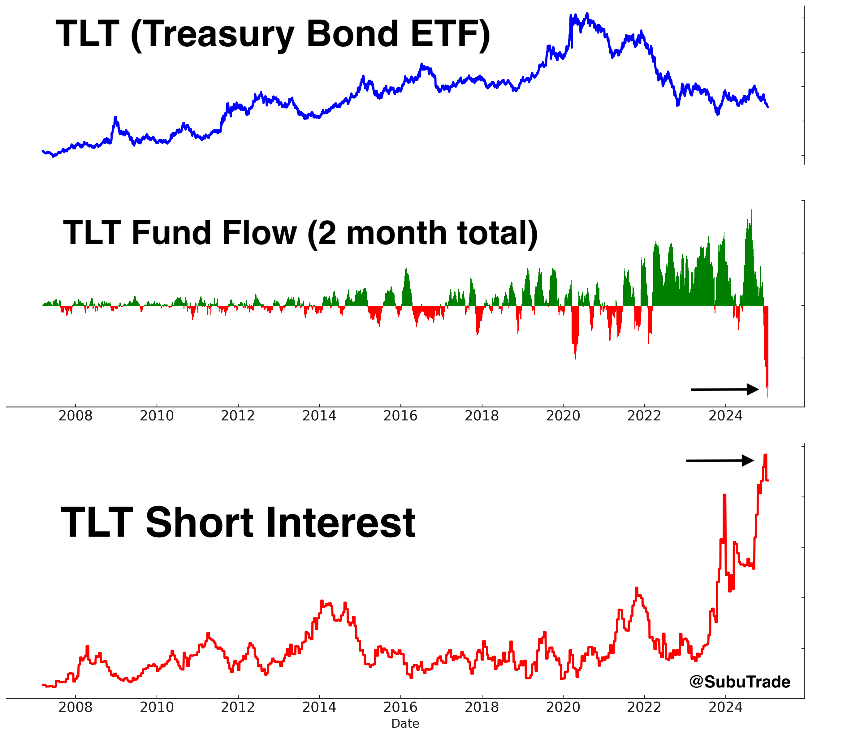 As I shared on Twitter/X, the past 2 months have seen record outflows from TLT while short interest is near an all-time high: