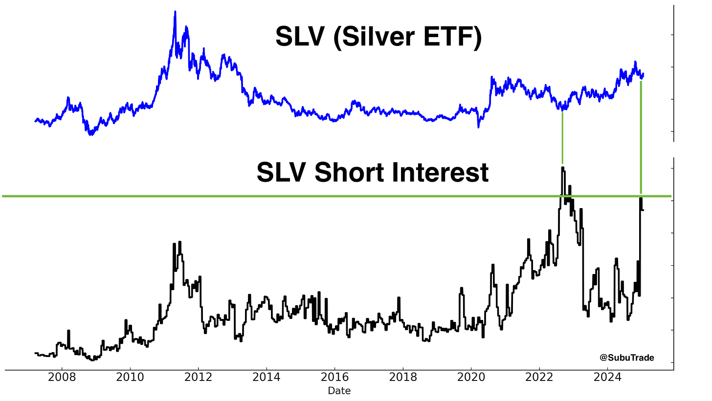 A bond market rally (drop in rates) might also drive gold and silver prices higher. SLV’s short interest is near an all-time high: