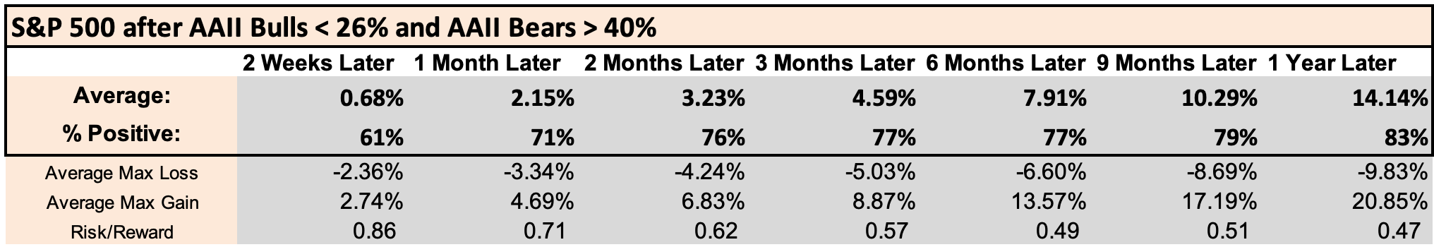 In the 137 historical weeks when Bulls were less than 26% and Bears were more than 40%, the stock market had a tendency to rally over the next 1-2 months: