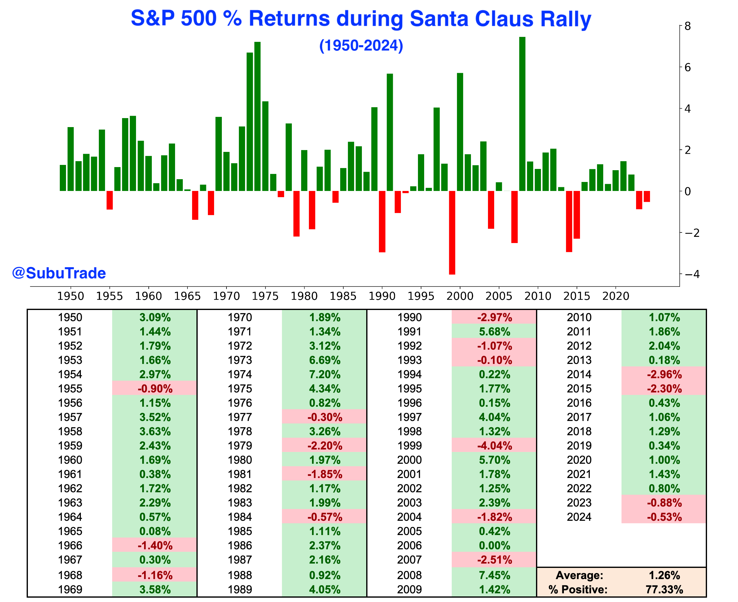 The year-end “Santa Claus Rally” period begins Wednesday December 24. It covers the last 5 trading days of this year + the first 2 of January. This was historically bullish from a seasonality perspective: