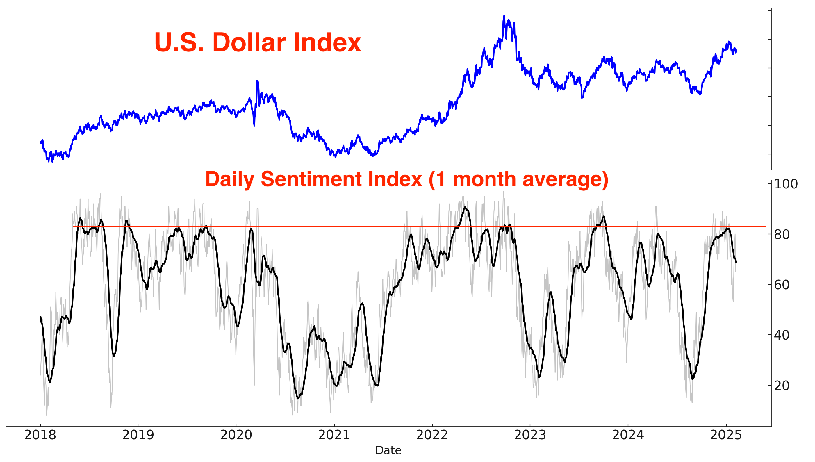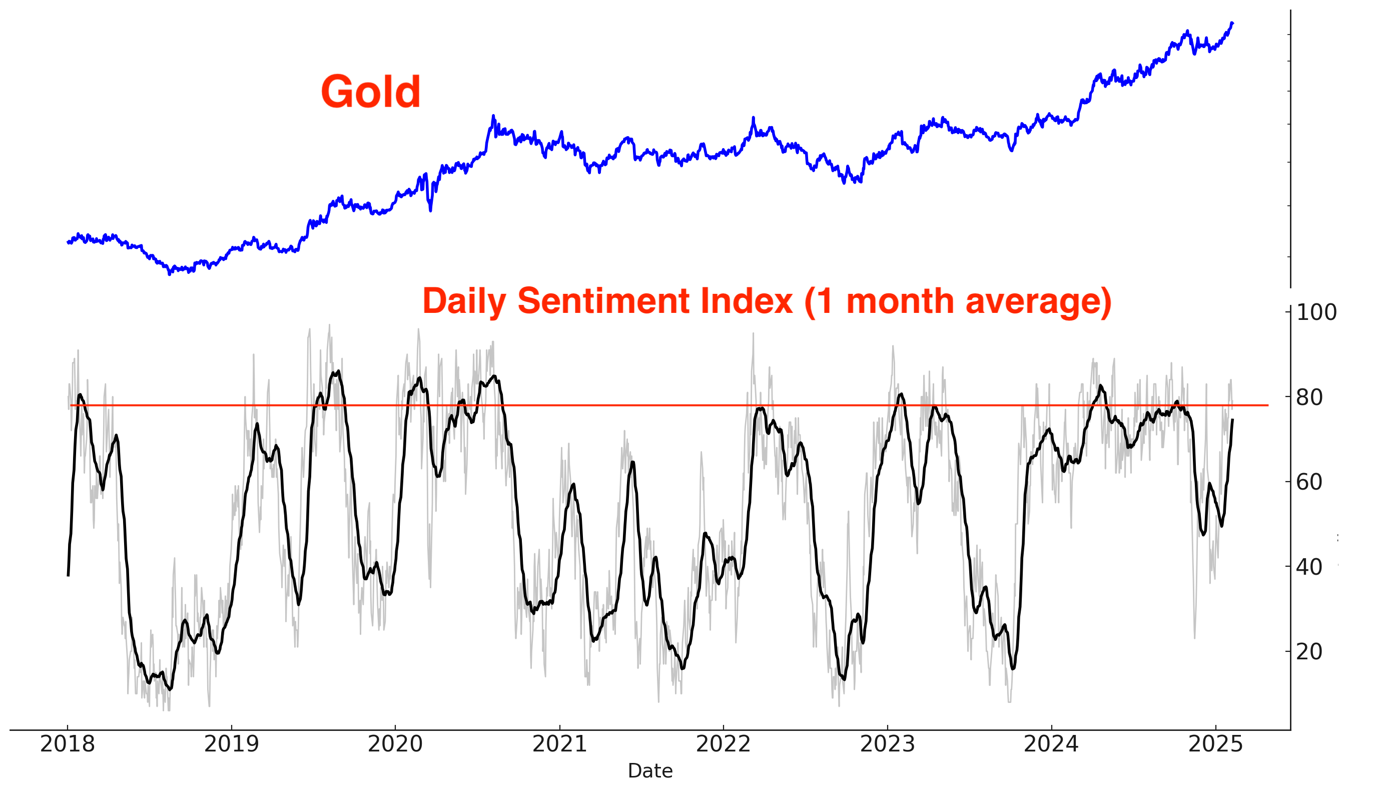 Similarly, gold’s Daily Sentiment Index is rising rapidly and nearing concerning levels. Monitor this closely in the coming days/weeks: