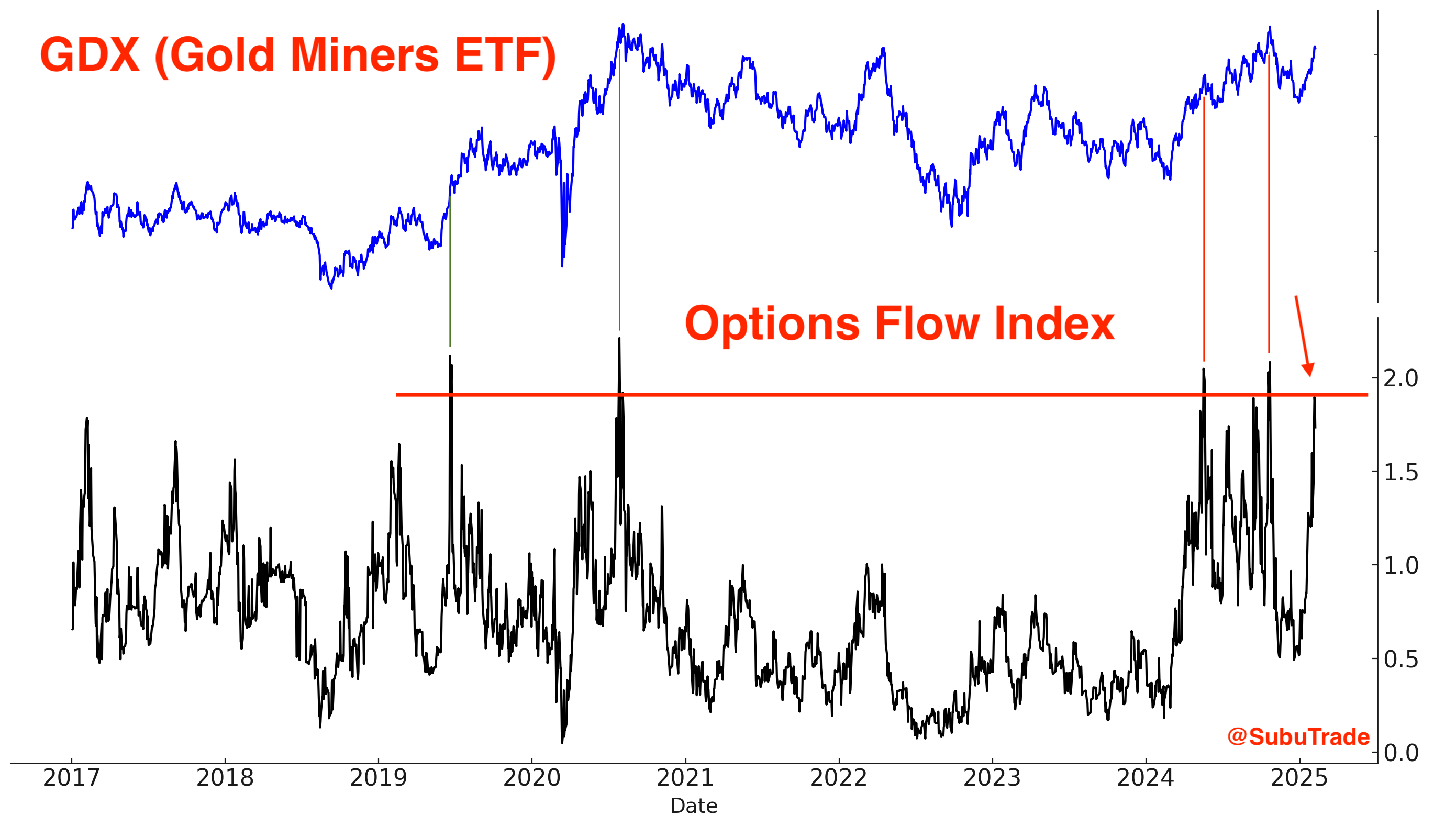 Gold Miners rallied significantly in the past few weeks. Here’s the GDX Options Flow Index. A minor short term concern: