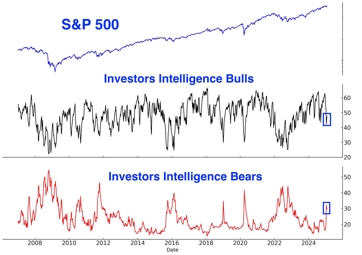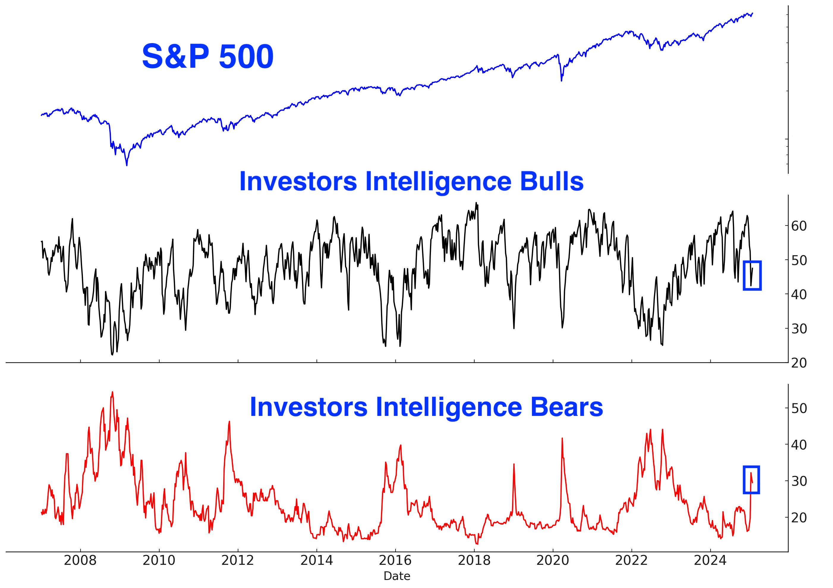 The Investors Intelligence Sentiment Survey reflects a similar level of anxiety. Bullish sentiment remains subdued, while bearish sentiment is elevated—an unexpected development given the S&P 500's proximity to an all-time high.