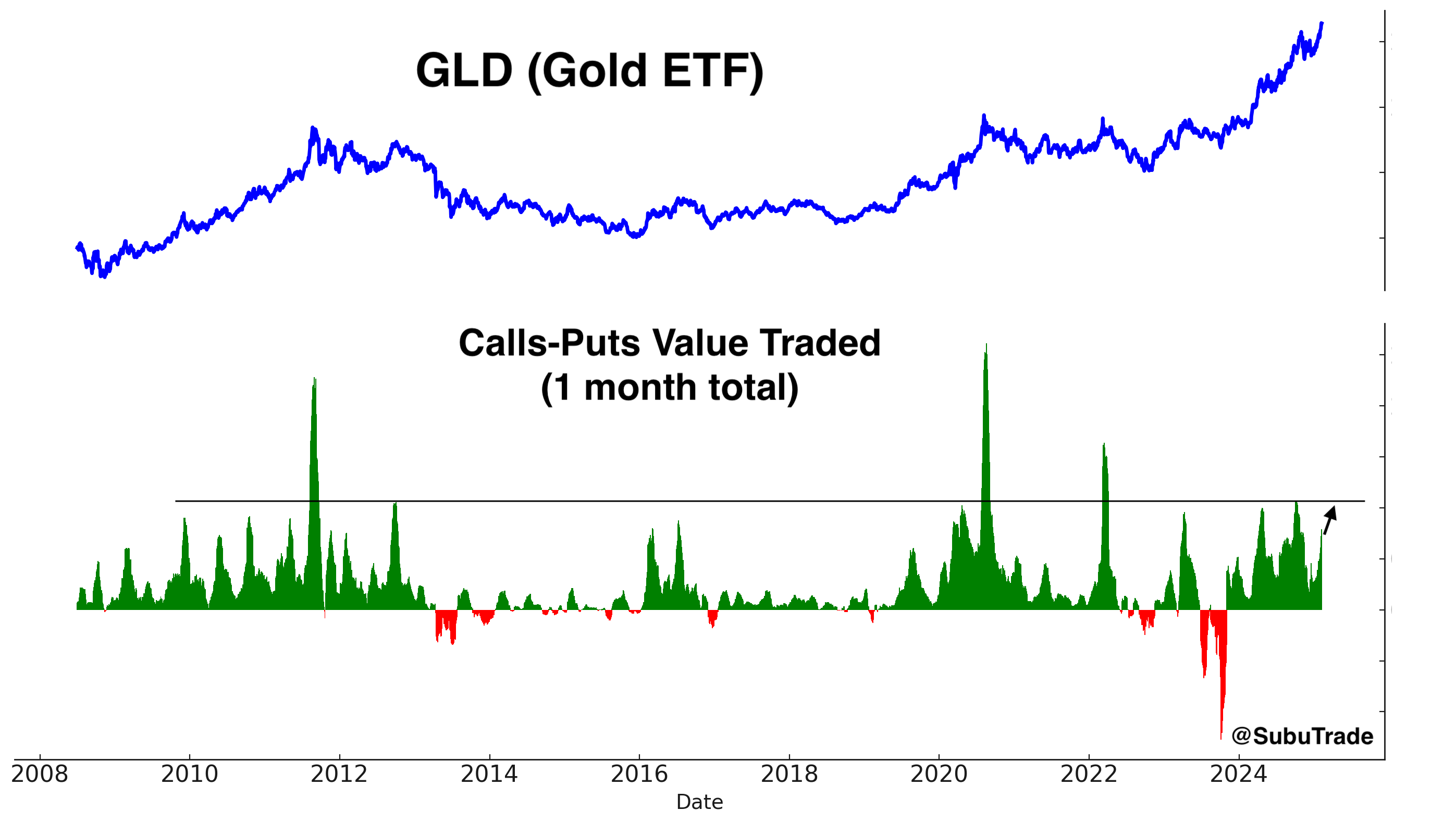 Here’s the value of Calls-Puts traded for GLD over the past month. This figure is approaching concerning levels, but not quite there yet.