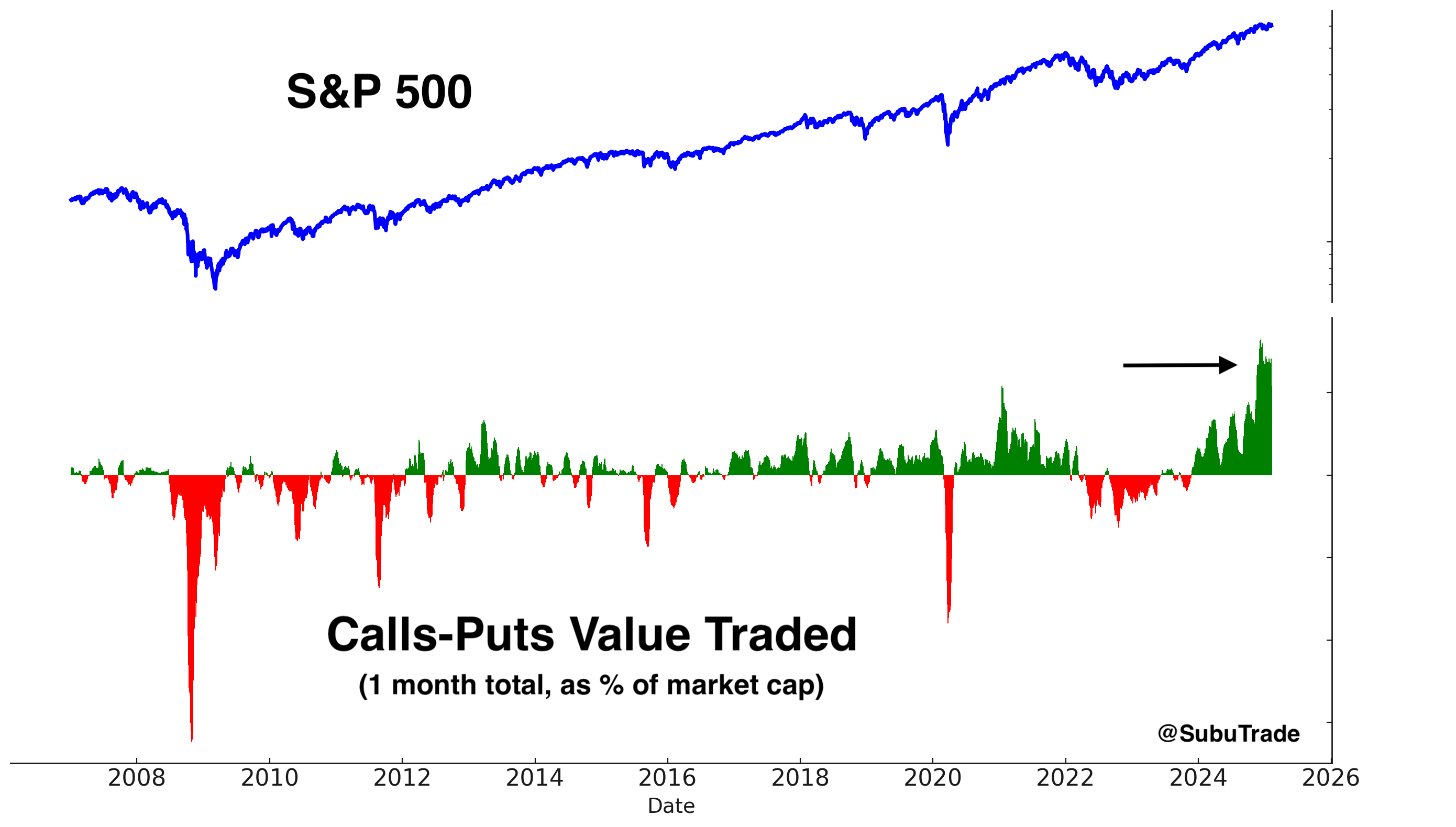 The value of Calls-Puts traded for the S&P 500 is still very high, but coming down a little. This warrants caution: