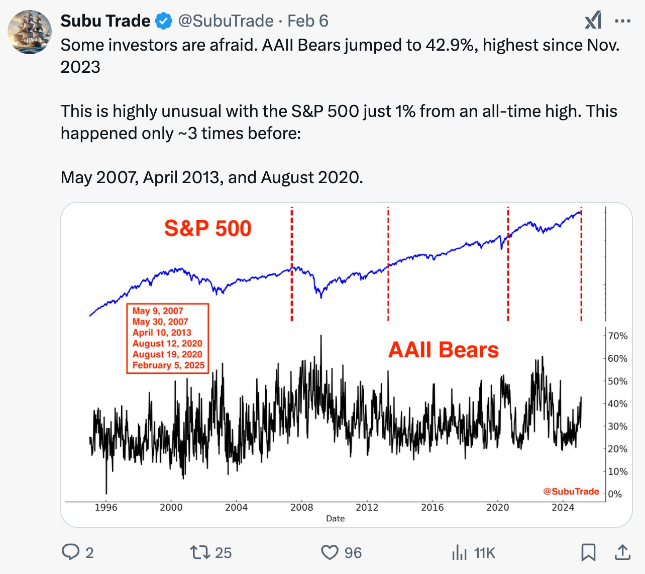 As I highlighted on Twitter/X, investor sentiment surveys indicate a rise in market anxiety. AAII Bears jumped to 42.9%, marking its highest level since November 2023. This is particularly notable given that the S&P 500 remains near an all-time high. Historically, such elevated bearish sentiment is typically observed when the S&P is trading at significantly lower levels.