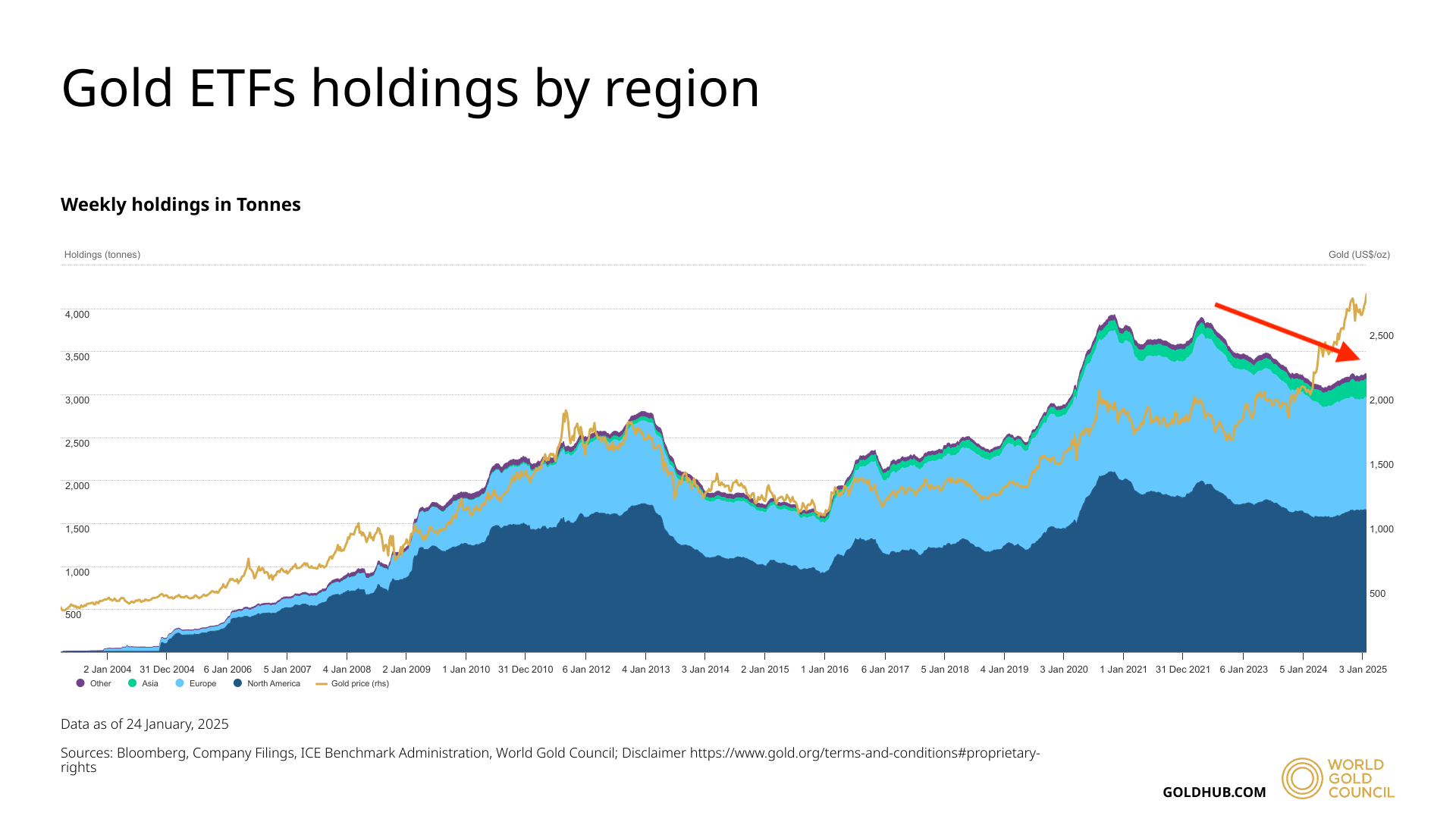 While central banks continue to accumulate gold, retail investors remain largely on the sidelines. The following chart highlights gold holdings in ETFs. Historically, gold bull markets have been accompanied by rising prices and increasing ETF holdings. However, in the current bull market, gold prices are climbing while ETF investors are exiting—a notable divergence.