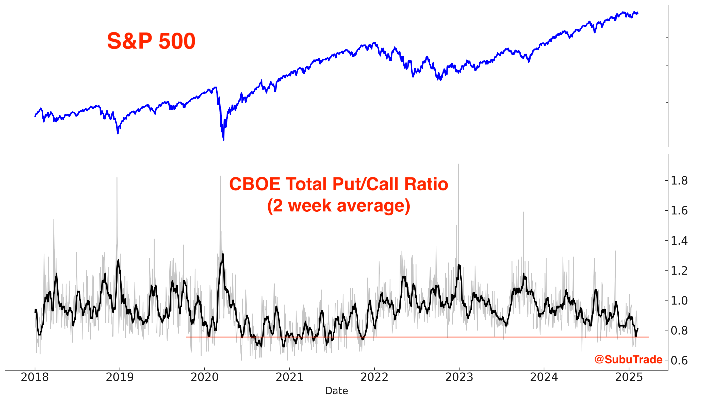 From a longer term perspective, the CBOE’s Total Put/Call Ratio is still very low. This is a long term concern: