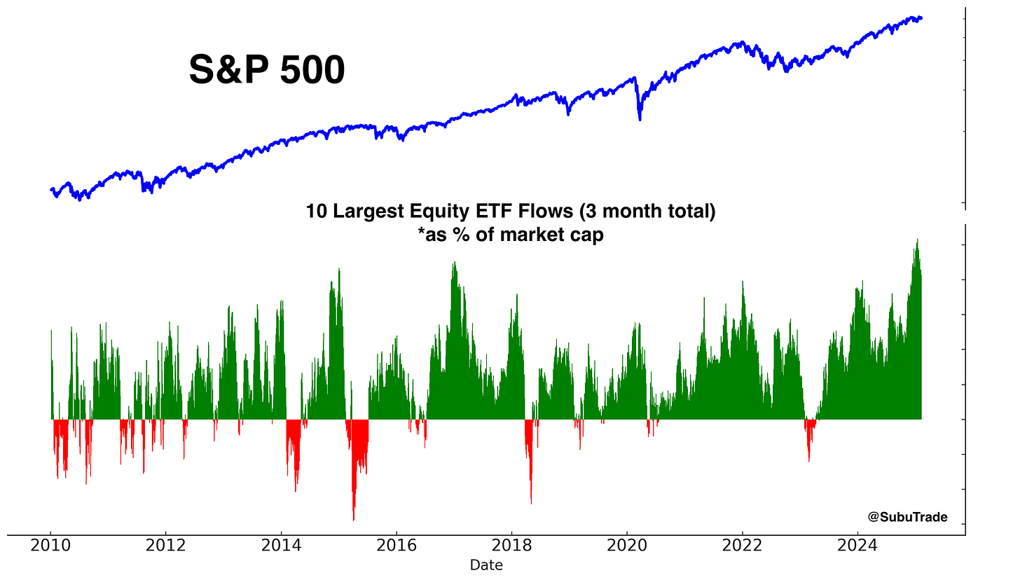 Here’s the latest update on equity ETF fund flows, a key concern I’ve been monitoring in recent weeks. While inflows remain elevated, they are beginning to decline. The U.S. stock market’s prolonged sideways price action appears to be unnerving investors.