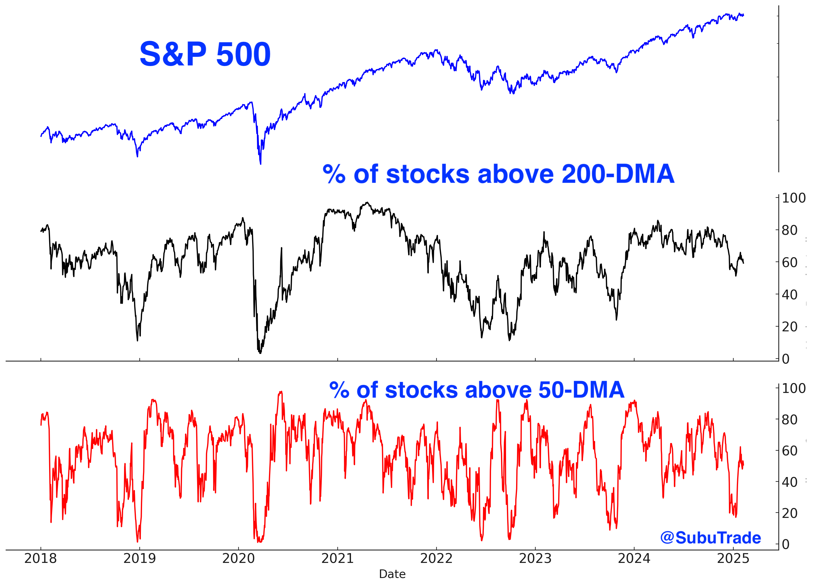 Here’s the % of S&P 500 stocks above their 200 and 50 day moving averages:
