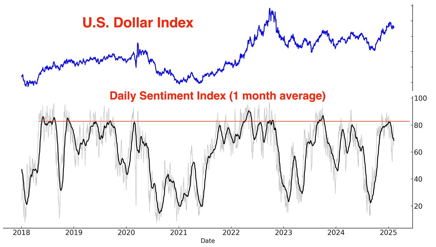 As non-U.S. equities, gold, and bonds experience a strong rally, the U.S. dollar is undergoing a noticeable pullback. The Dollar’s Daily Sentiment Index indicates further downside potential before this pullback reaches completion.