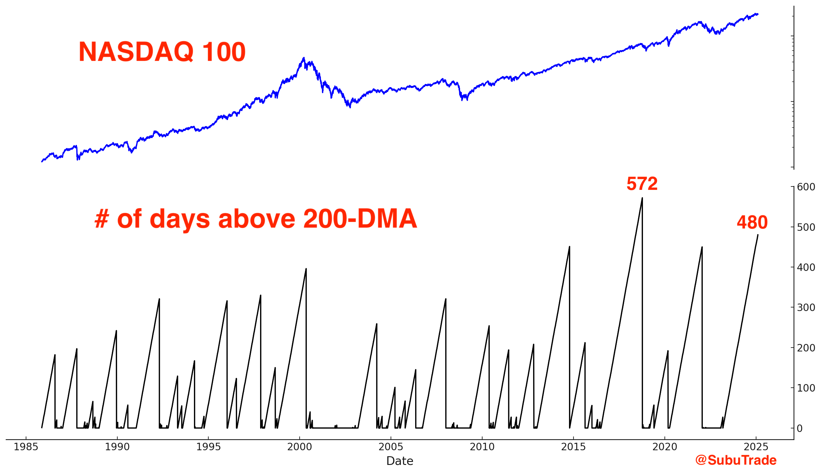 The trend is your friend, until it ends. Will it end now? The S&P 500 has remained above its 200 day moving average for more than a year while the NASDAQ 100 has remained above its 200 day moving average for almost 2 years!