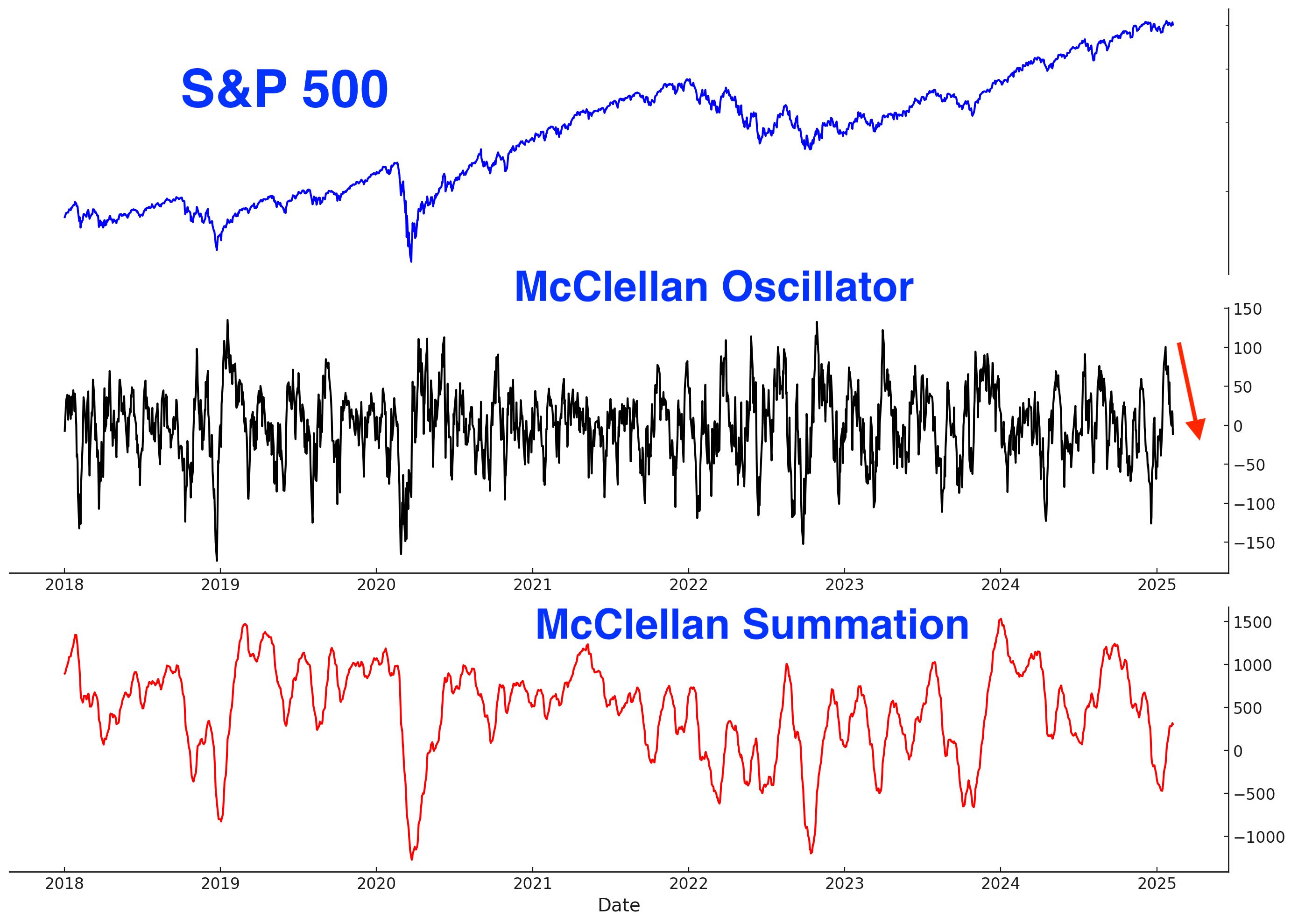 Here’s the S&P 500 McClellan Oscillator and McClellan Summation Index: