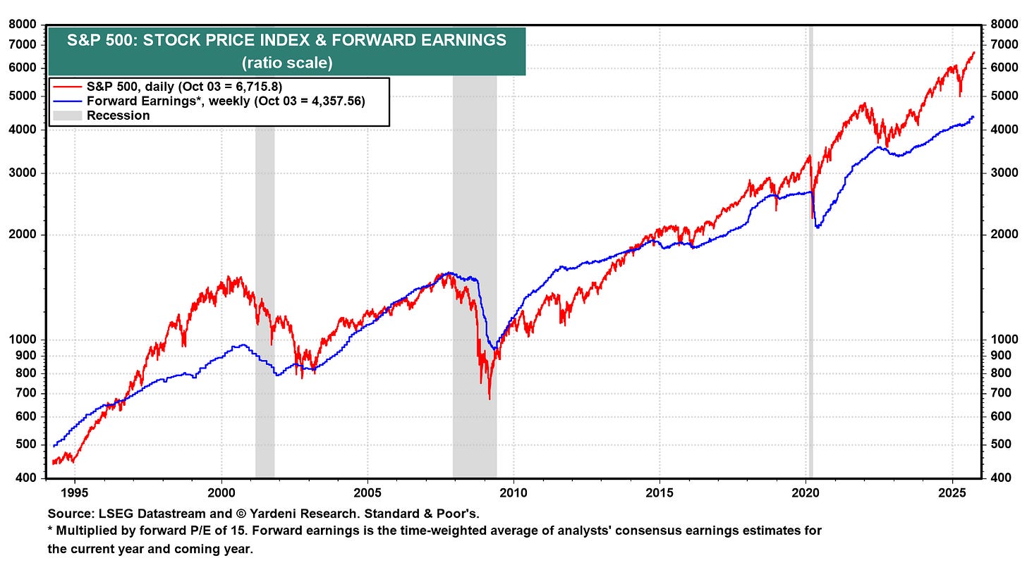 Here’s the S&P 500’s forward earnings expectations. In the long run, earnings and stock prices move in the same direction. Earnings are still growing right now.