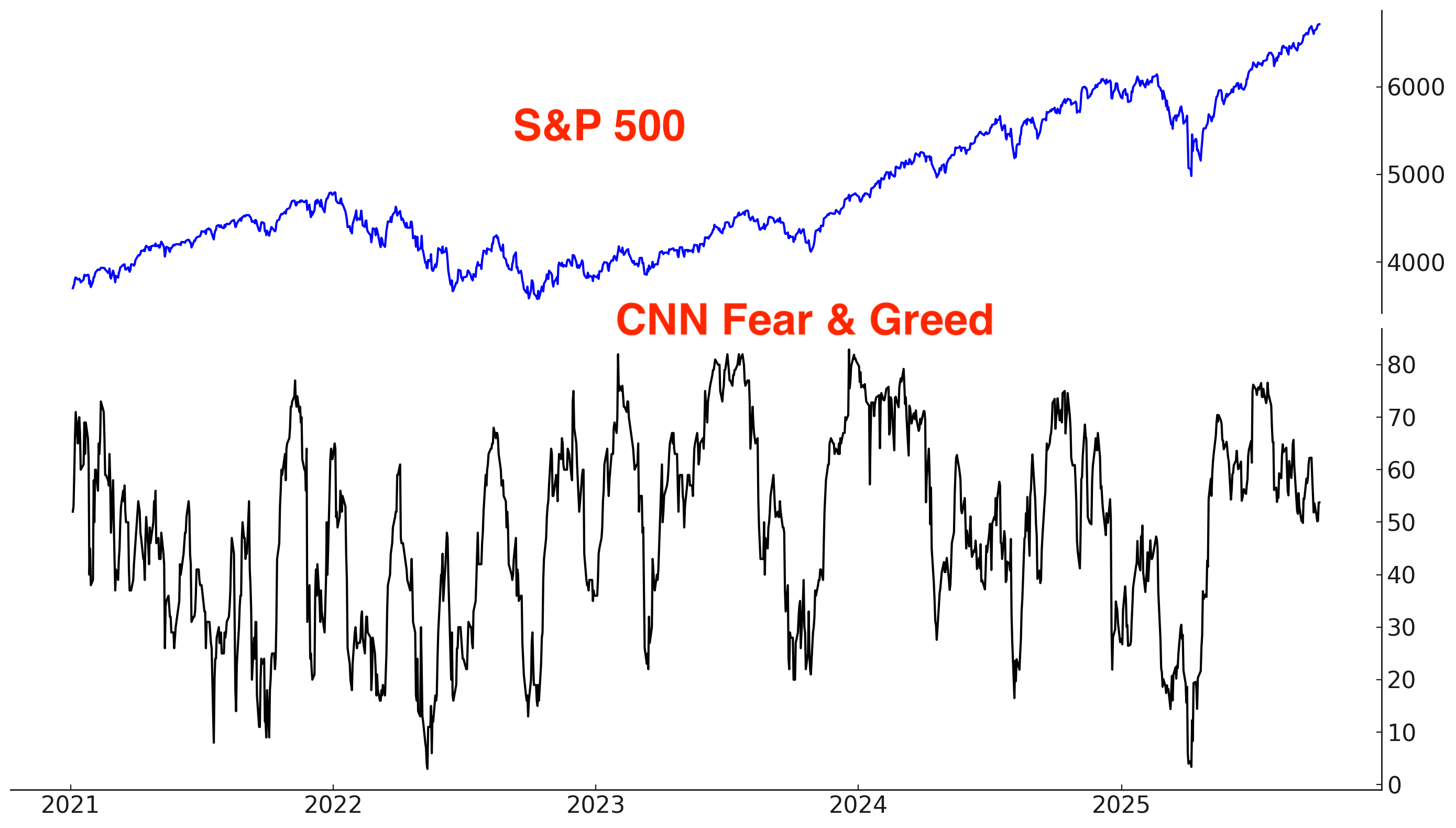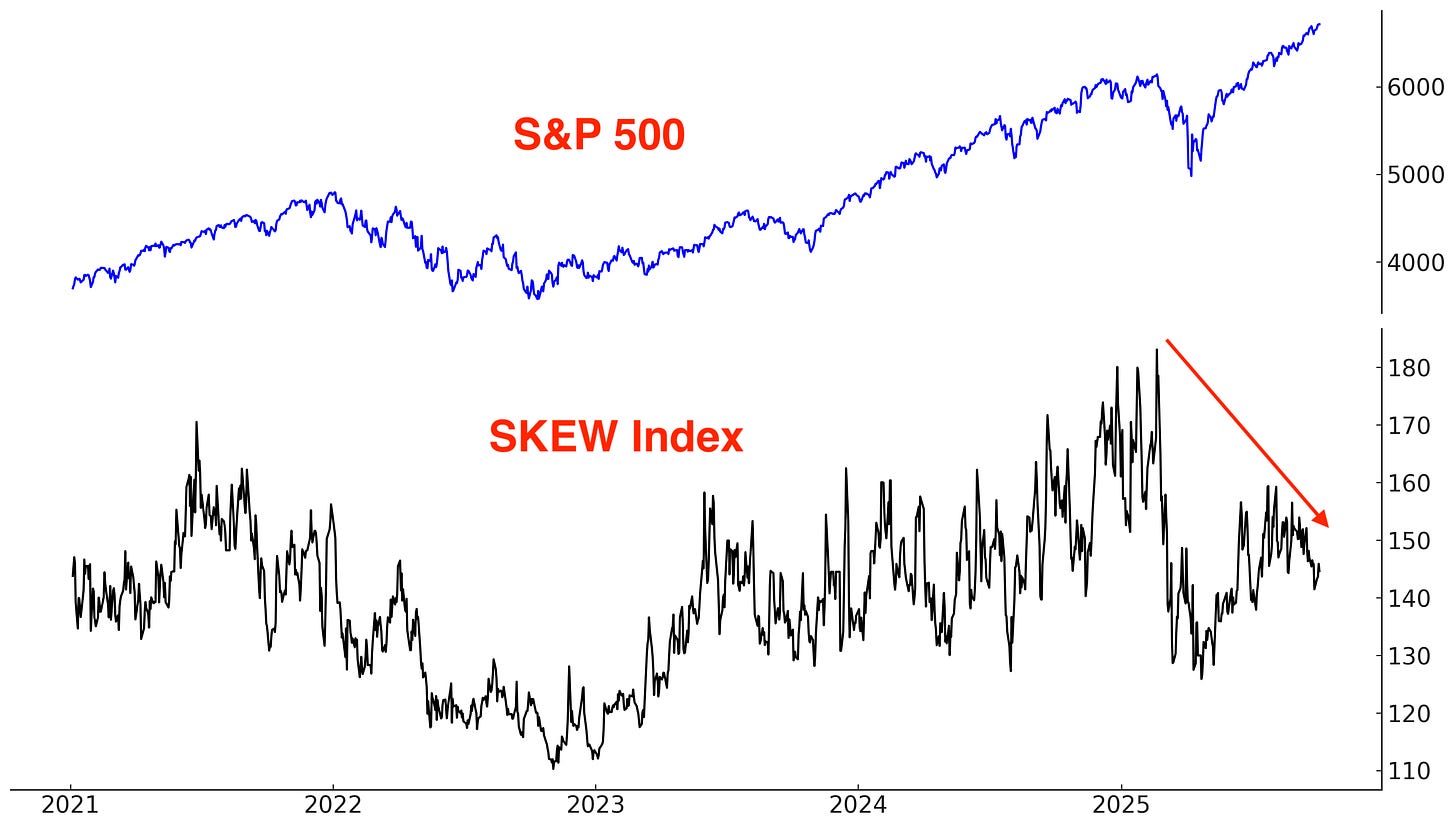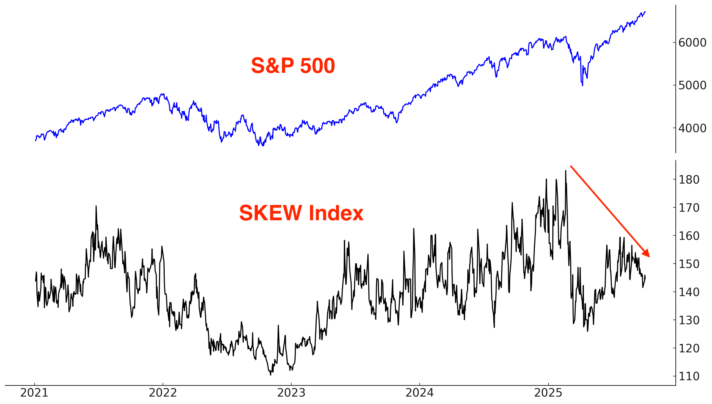 The SKEW Index, which reflects perceived tail risk in the options market — or the probability of extreme downside moves — remains muted. This suggests that any stock market pullback right now will not turn into a major crash.