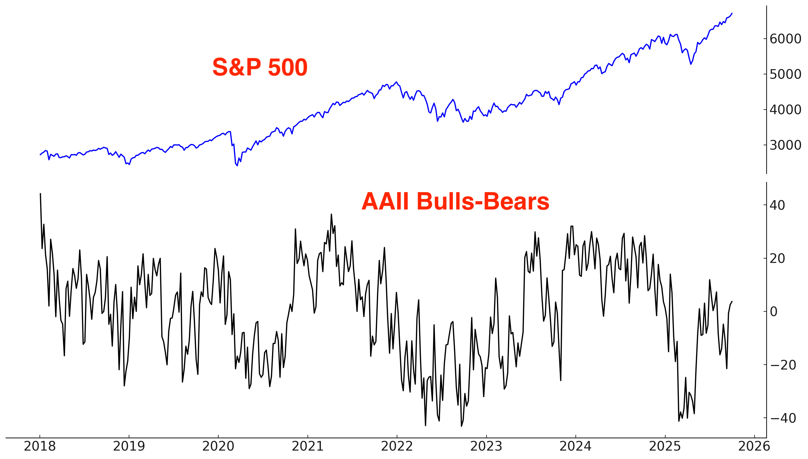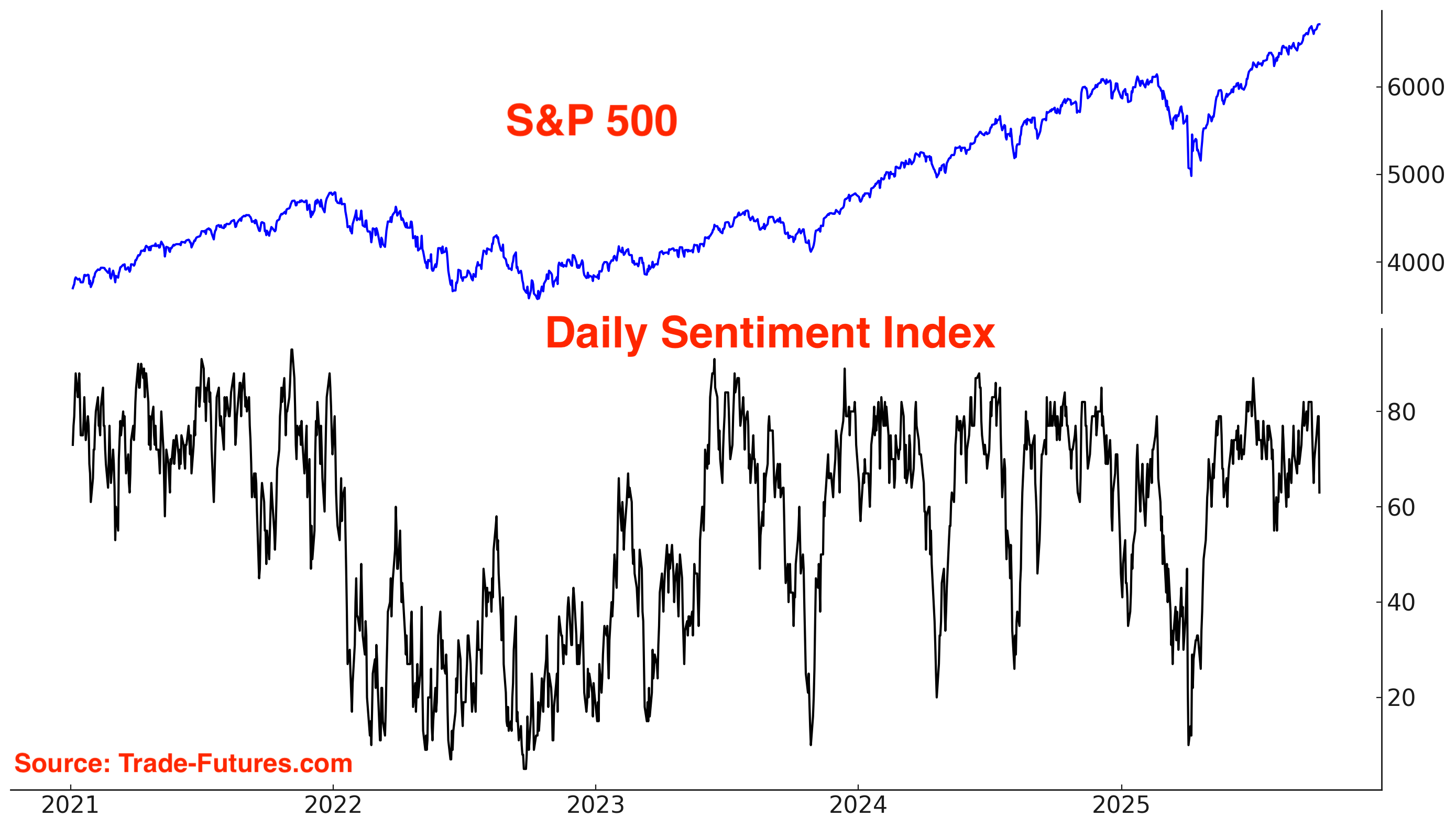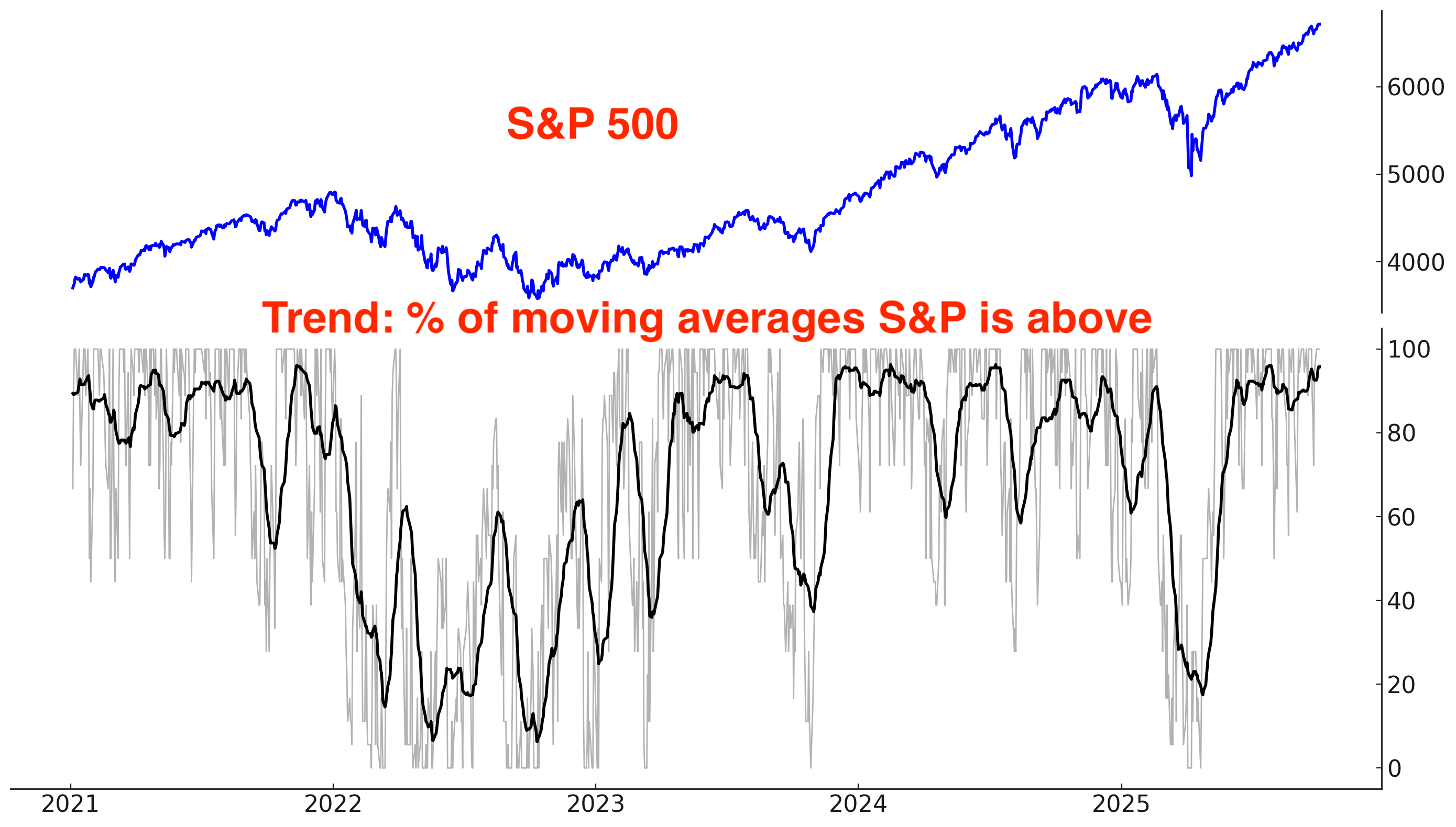 The SKEW Index, which reflects perceived tail risk in the options market — or the probability of extreme downside moves — remains muted. This suggests that any stock market pullback right now will not turn into a major crash.