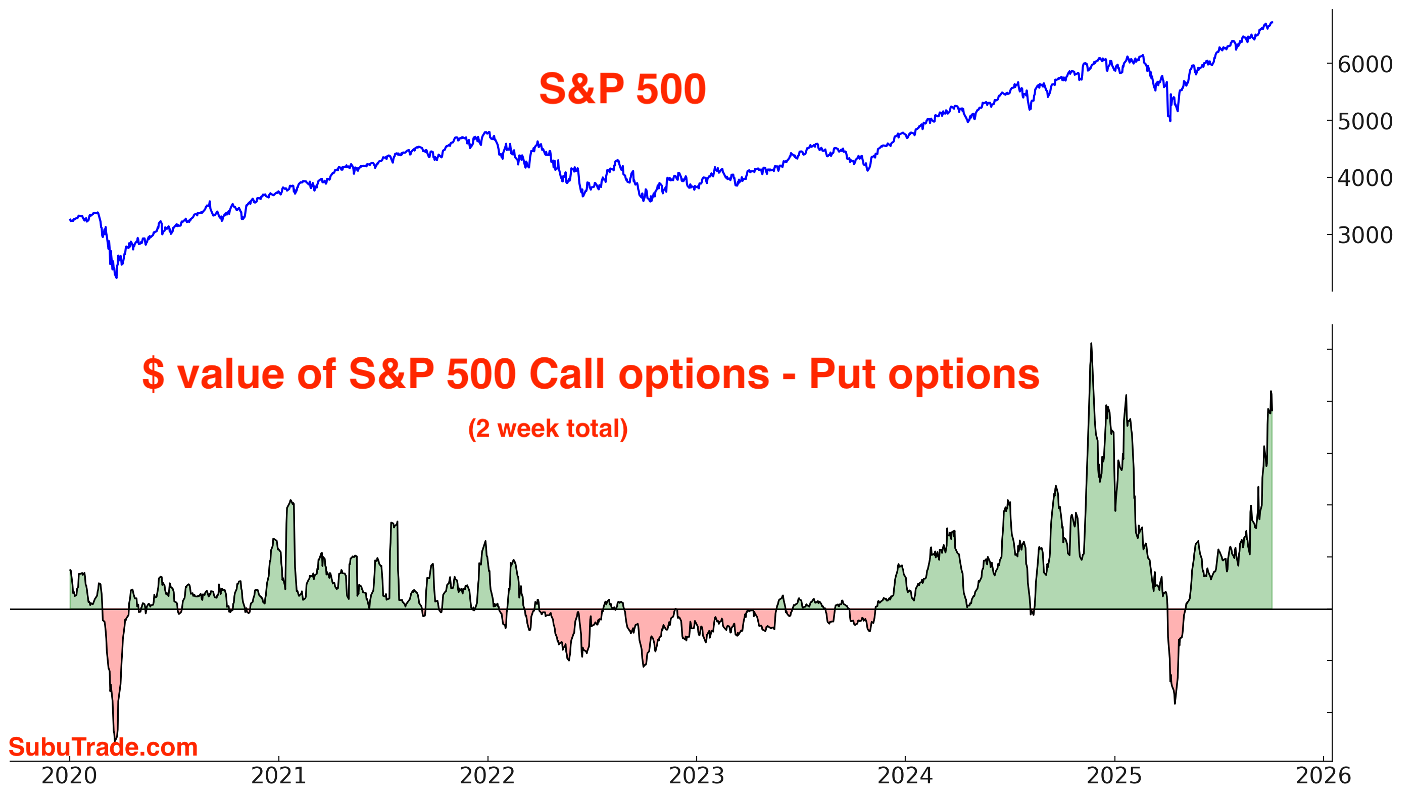 The $ value of S&P 500 Call volume - the $ value of S&P 500 Put volume is surging higher. The last time this happened was at the end of last year, before stocks plateaued ahead of this year’s crash in March/April.