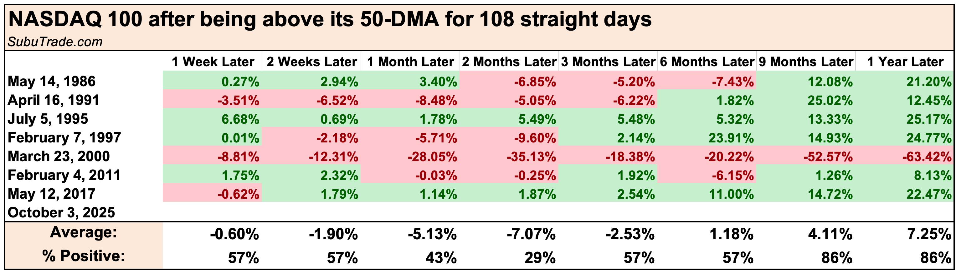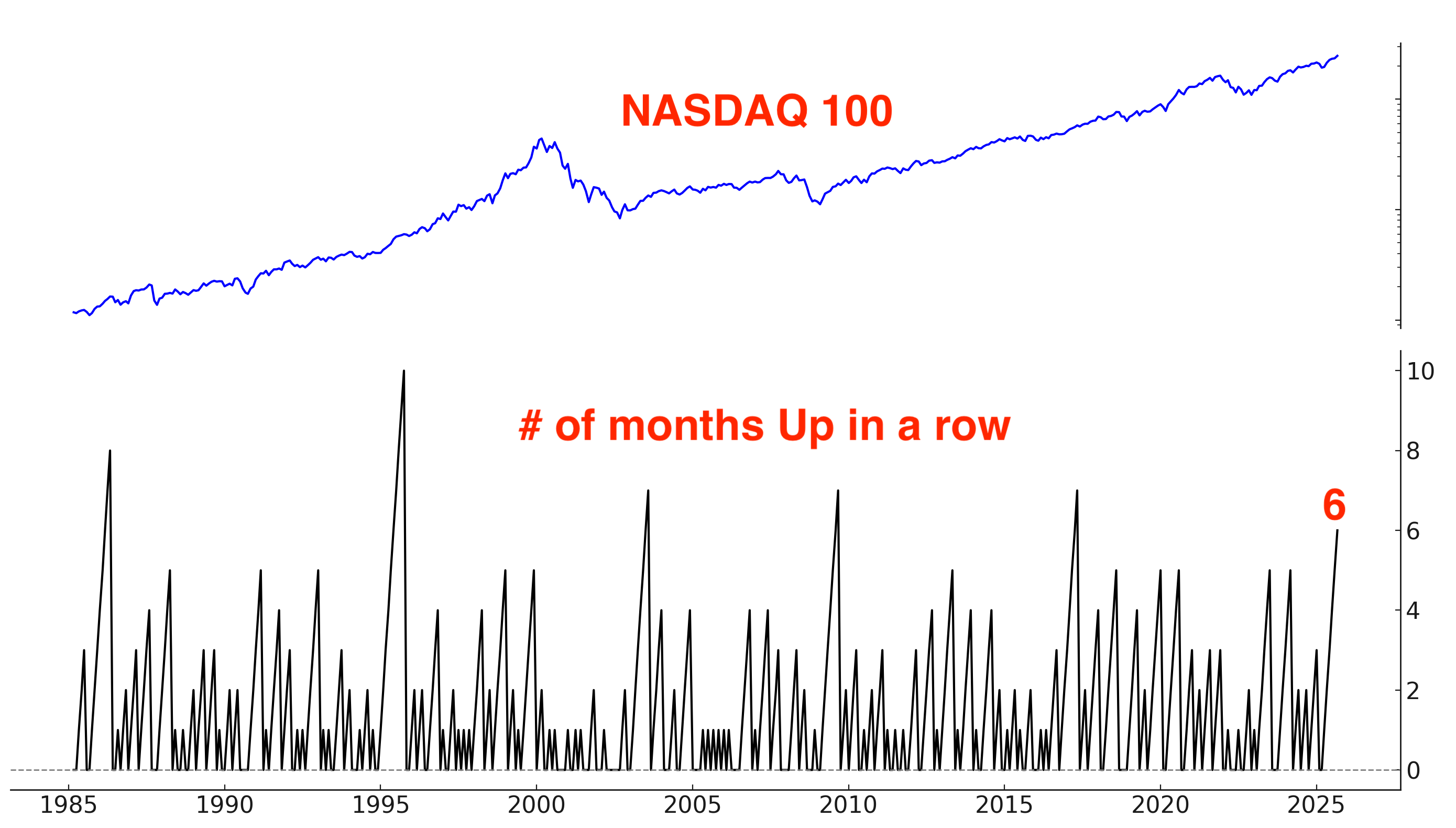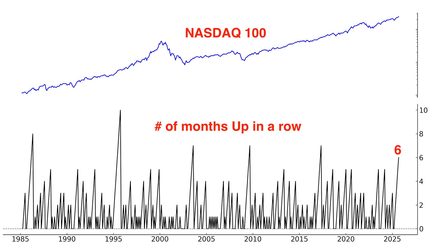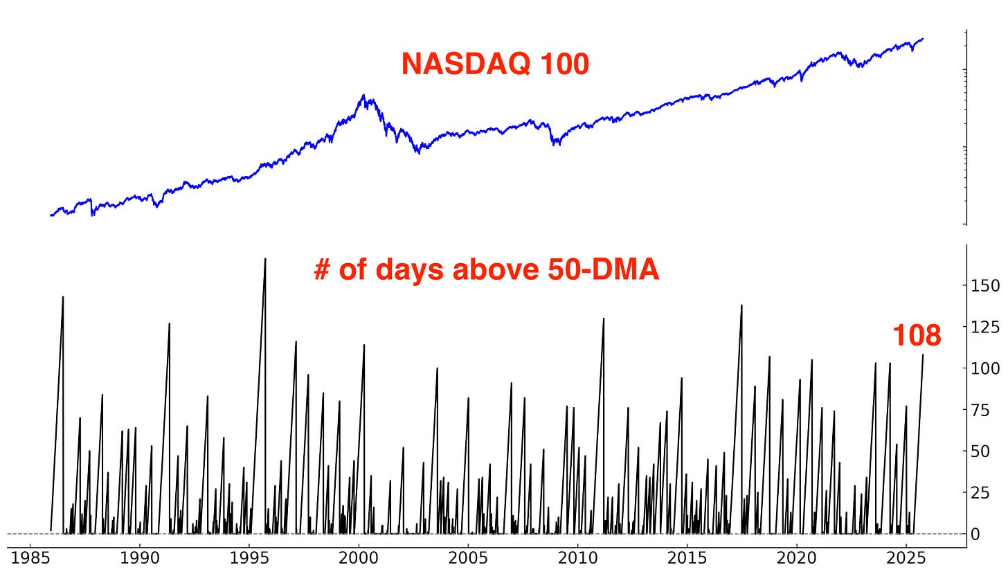 The Everything Rally continues. Stocks rally non-stop, gold and silver push higher relentlessly, and once-hated markets like Chinese equities grind higher. To put this rally into perspective: the NASDAQ 100 has traded above its 50 day moving average for 108 consecutive days; the longest streak since the 2017 melt-up. All good things come to an end (eventually):