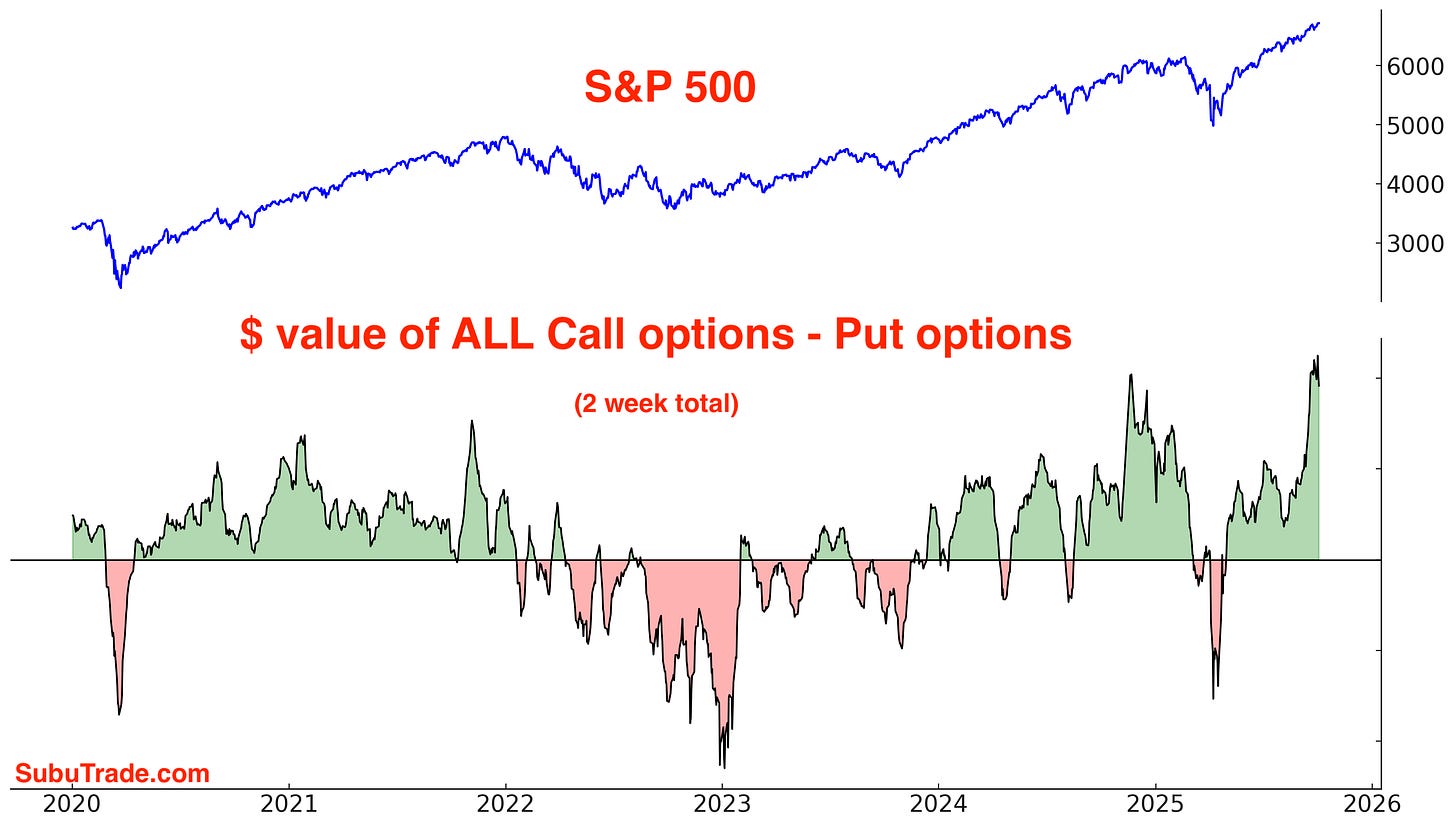 The $ value of ALL call options - put options is at an all-time high. This is concerning for stocks: