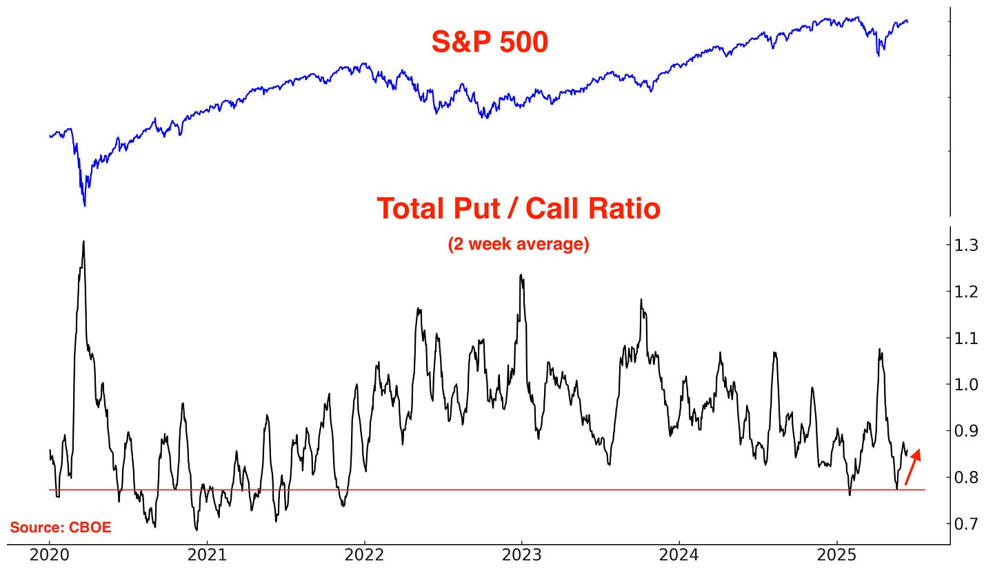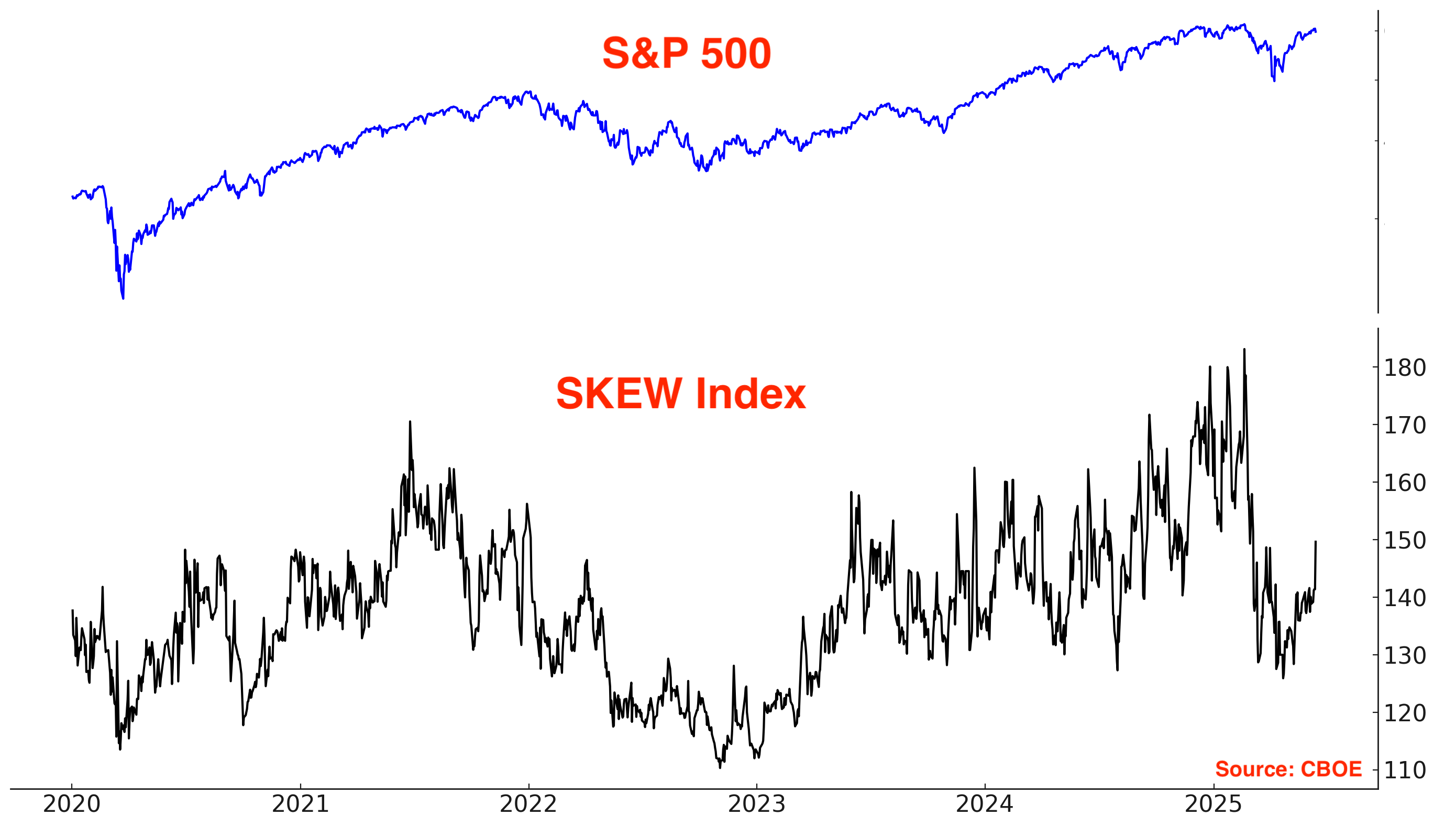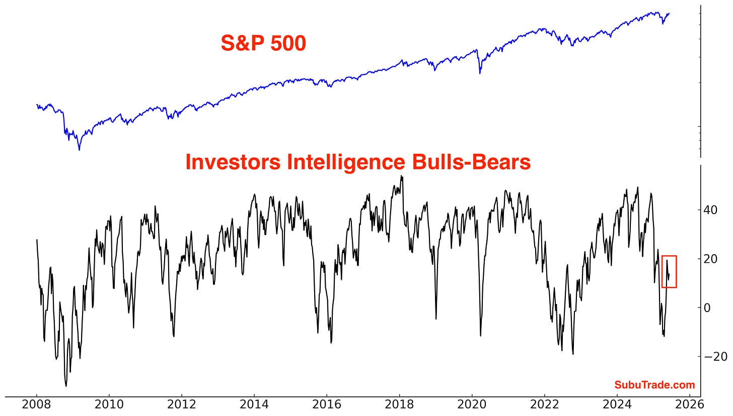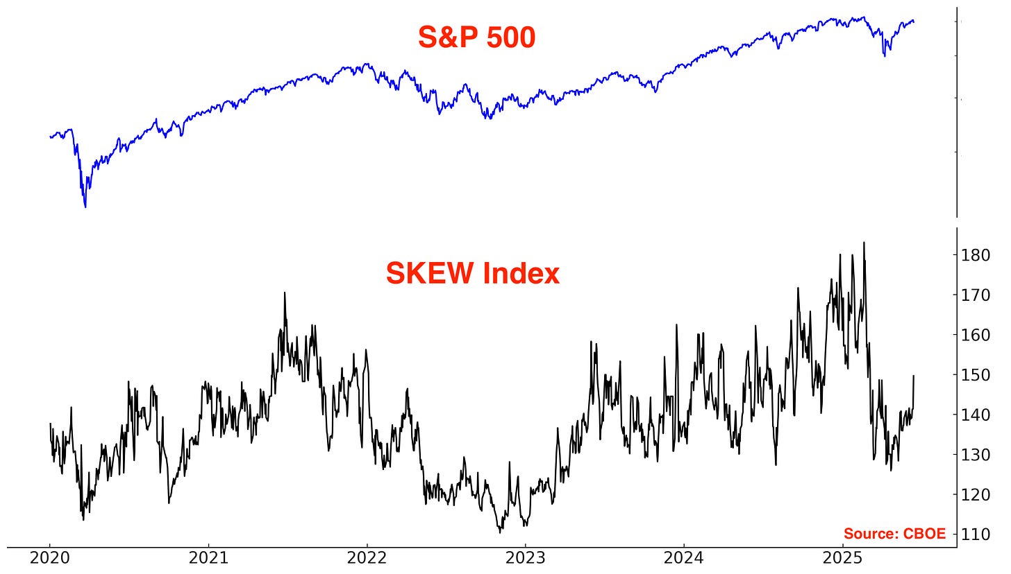 The SKEW Index, which reflects perceived tail risk in the options market — or the probability of extreme downside moves — remains muted. Despite stocks being near all-time highs, SKEW is well below the elevated levels seen earlier this year.