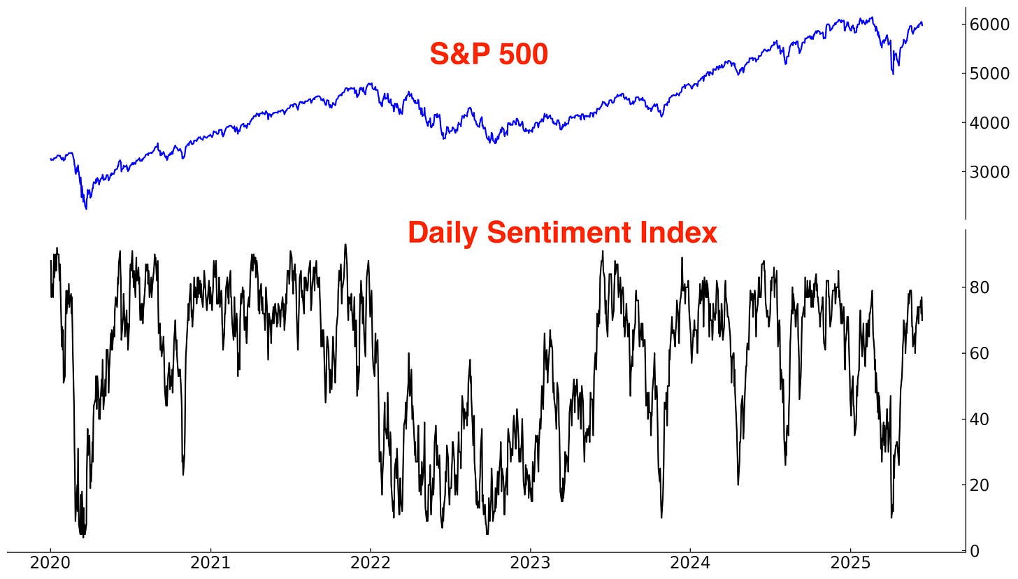 Likewise, the S&P 500’s Daily Sentiment Index is elevated:
