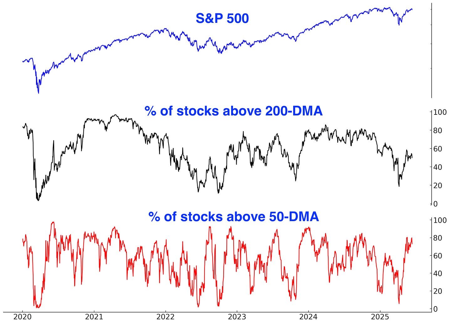 Here are the % of S&P 500 stocks above their 200 and 50 day moving averages.