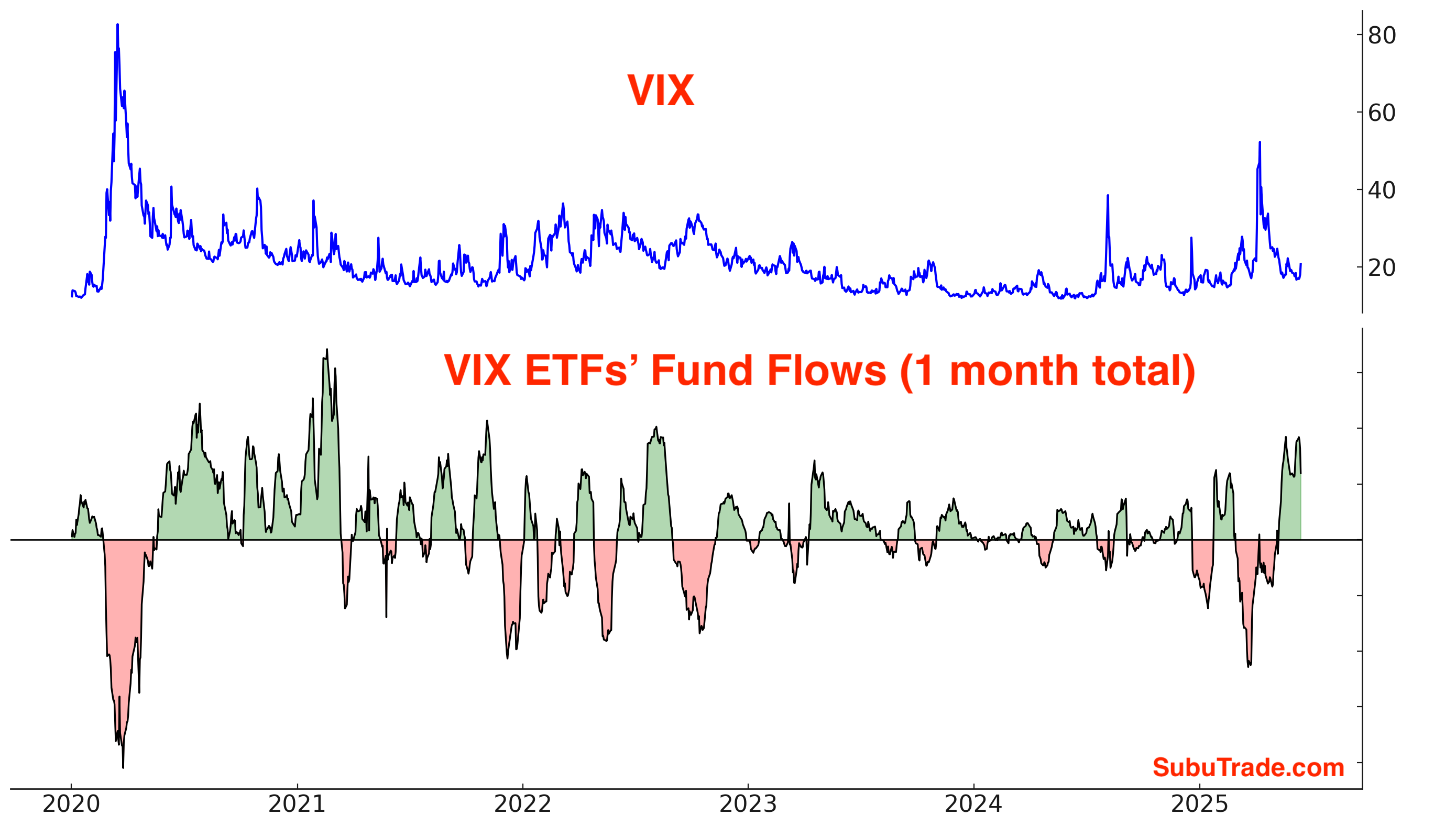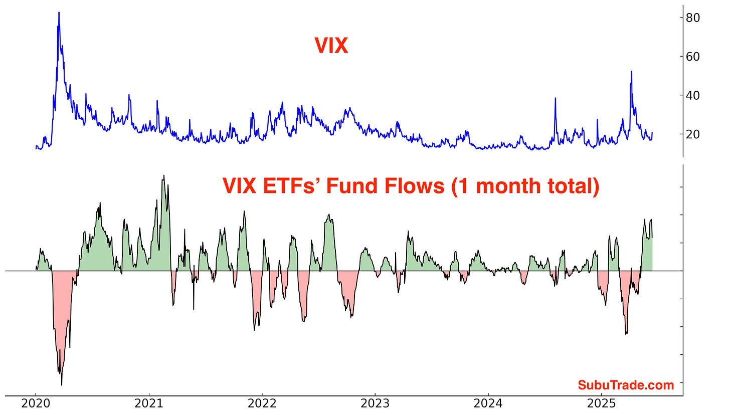VIX ETFs continue to see inflows, which suggests that these mean-reversion traders are betting on a jump in volatility: